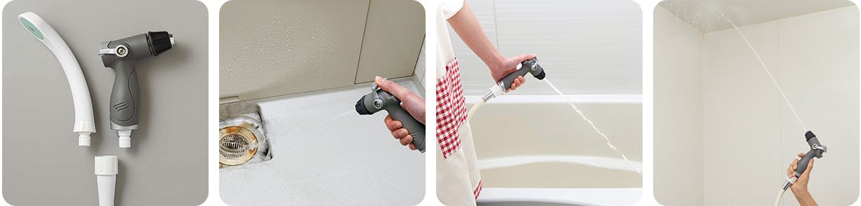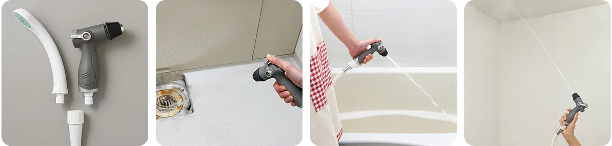 当社は生活雑貨のメーカーとして創業47年になり、新商品の開発数は年間約100アイテム以上。その中に「ジェット水流でラクラク風呂掃除!」という商品があります。お風呂掃除の時にシャワーヘッドに付け替えるだけでブラシのかわりにジェット水流でお掃除できるのが特徴です。