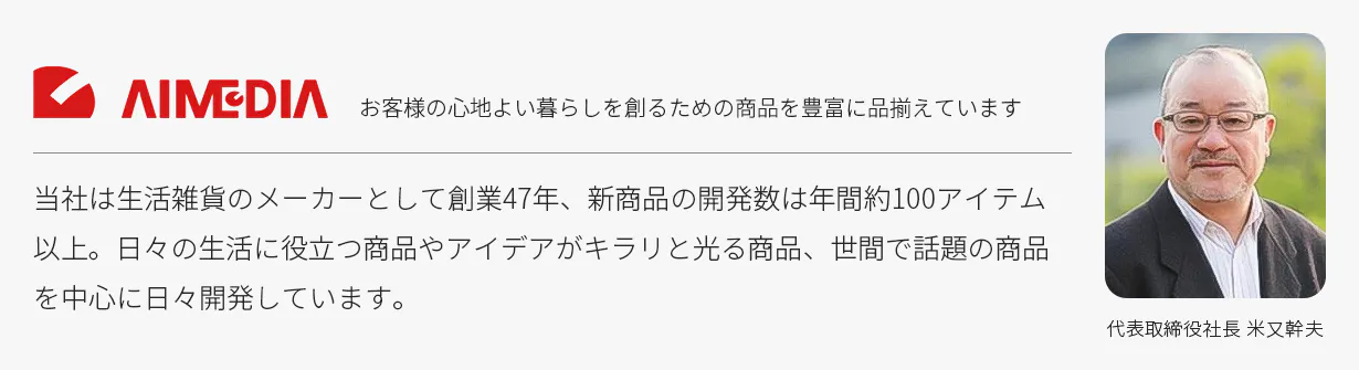当社は生活雑貨のメーカーとして創業47年になり、新商品の開発数は年間約100アイテム以上ございます。