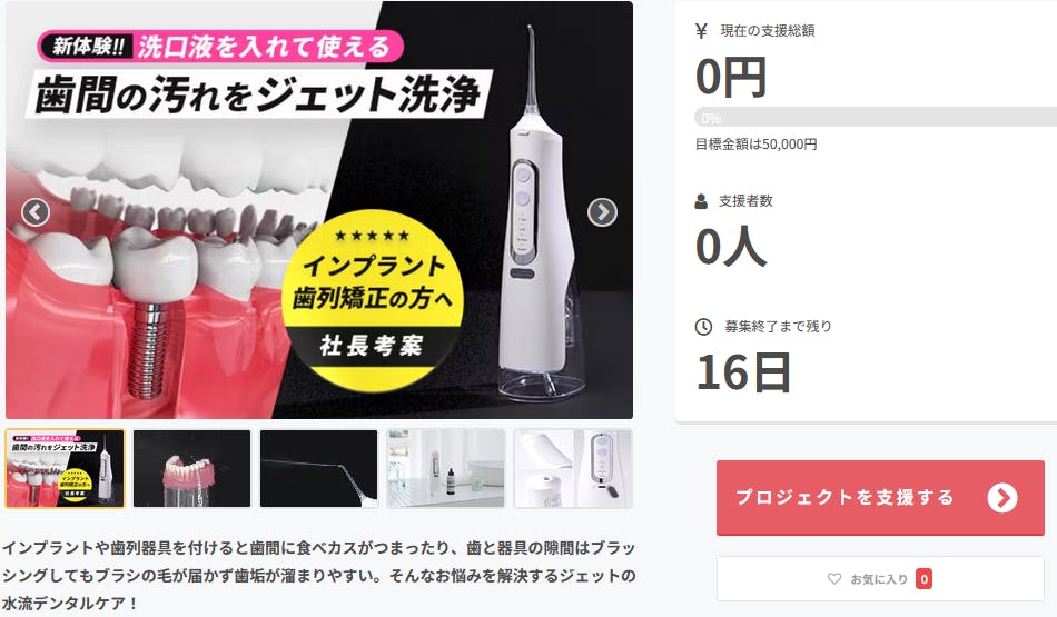 2024/06/14 17:31Campfireサポーターの皆様初めまして、aimedia_officialです!この度「インプラント利用者の社長考案!洗口液が使えるジェット水流でデンタルケア&口臭対策」プロジェクトスタートしました!残り16日間ですが、スタッフ一同頑張ります!皆様、ご支援のほどよろしくお願い致します!aimedia_official もっと見る