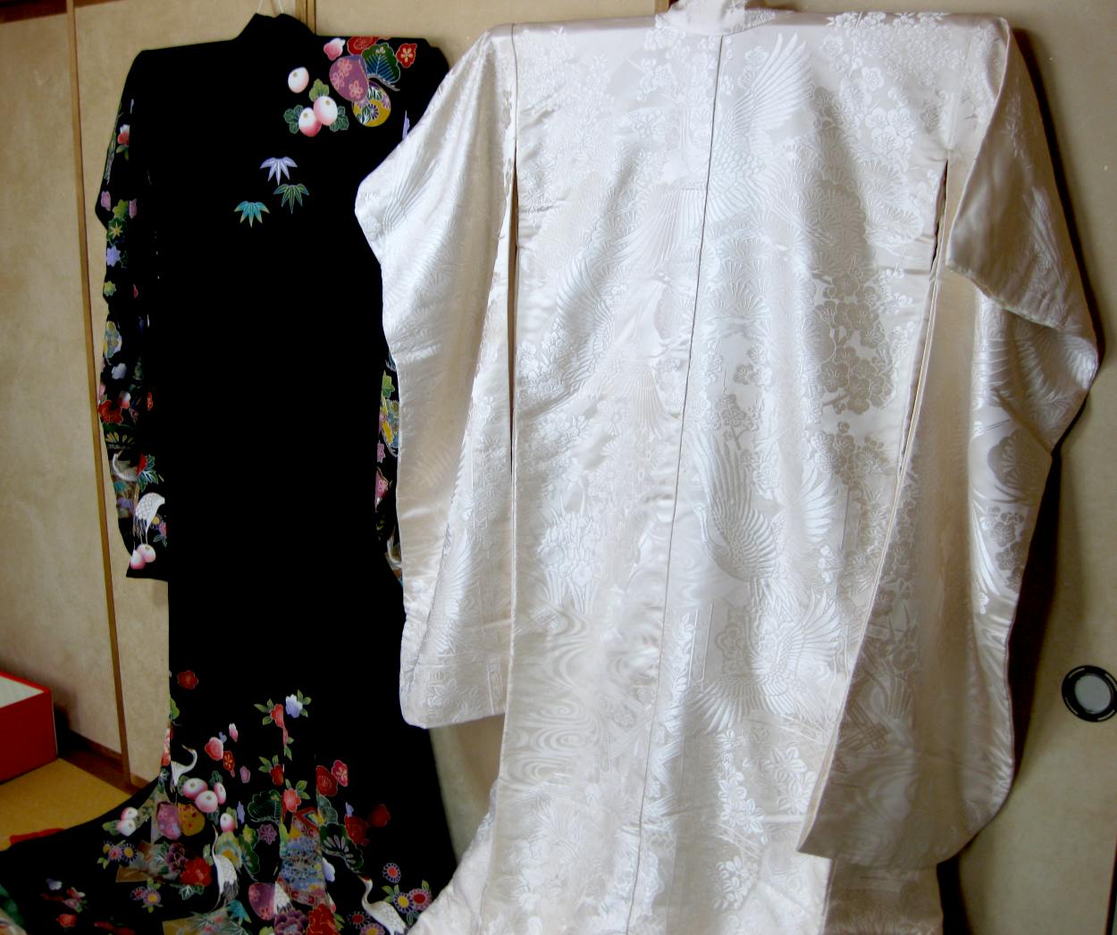 古い着物が着たい、という私の考えをすぐに受け止めてくれ、提案してくださったのが、写真にある着物でした。白無垢、黒引振袖ともに昭和初期に使われていたもので、ともに100%絹で作られていました。特に白無垢の色の自然な象牙色が印象的でした。(絹はより白さを出すため漂白しているものも多いとのことでした。)それに合わせた帯や、小物一式もそろえてくださいました。