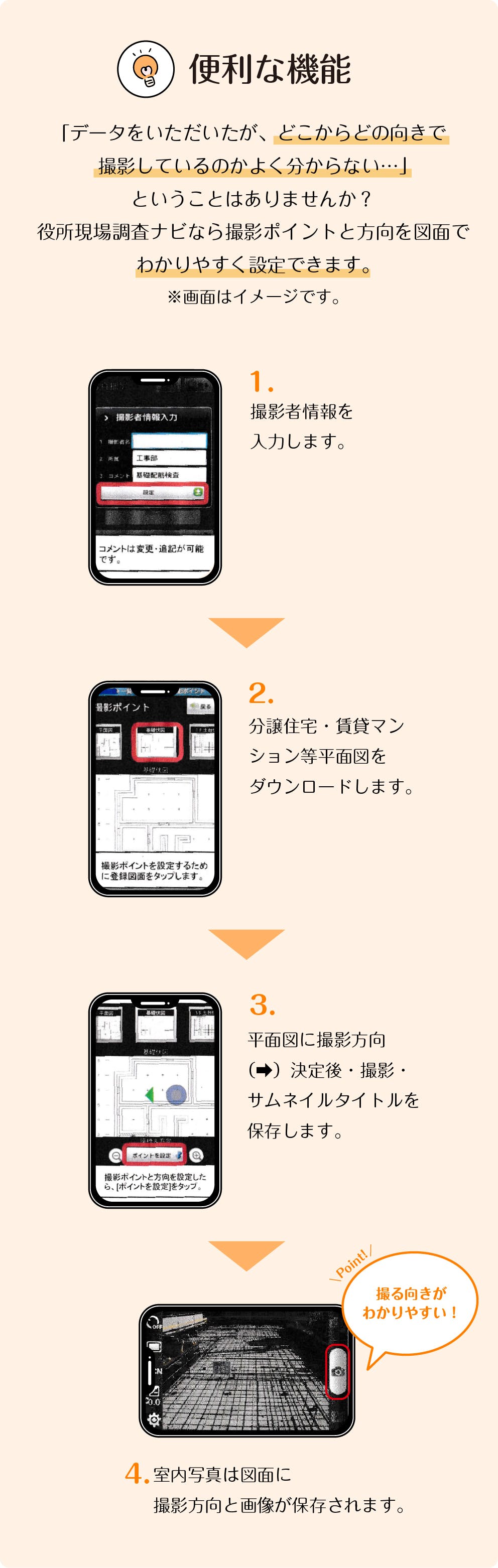 ②役所の口頭説明を同時録音する機能を設定。この2つの機能で調査ミスを大幅に削減する目的で開発しました。便利機能と致しまして、現場の問題点は、ビデオチャットにて問題点を可視化することで上司の適切な指示で問題解決が可能になりました。
