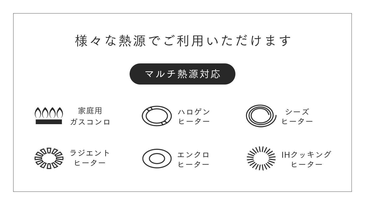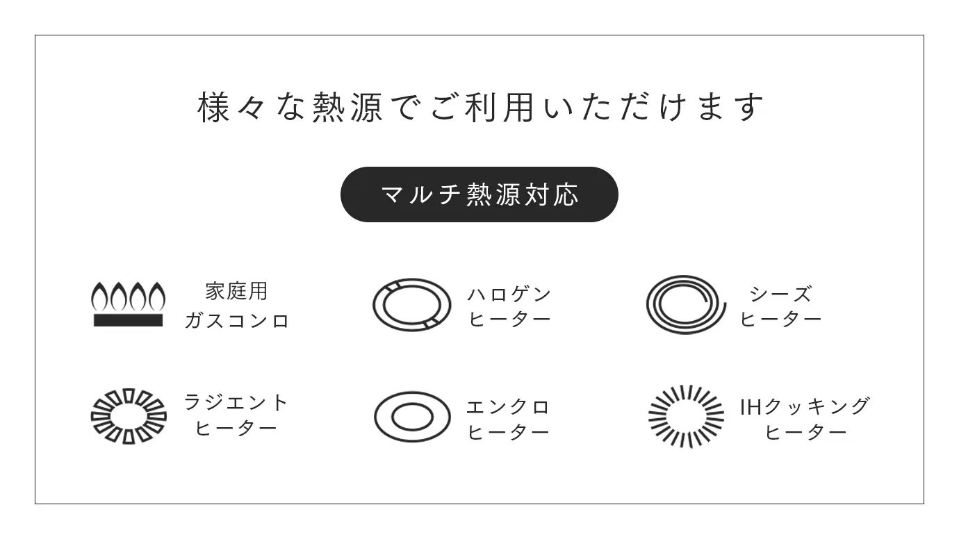 家庭用ガスコンロ・ラジエントヒーター・ハロゲンヒーター・エンクロヒーター・シーズーヒーター・電磁調理器(IHクッキングヒーター)いずれの熱源でも使用できます。用途に合った調理器具を使用してください。