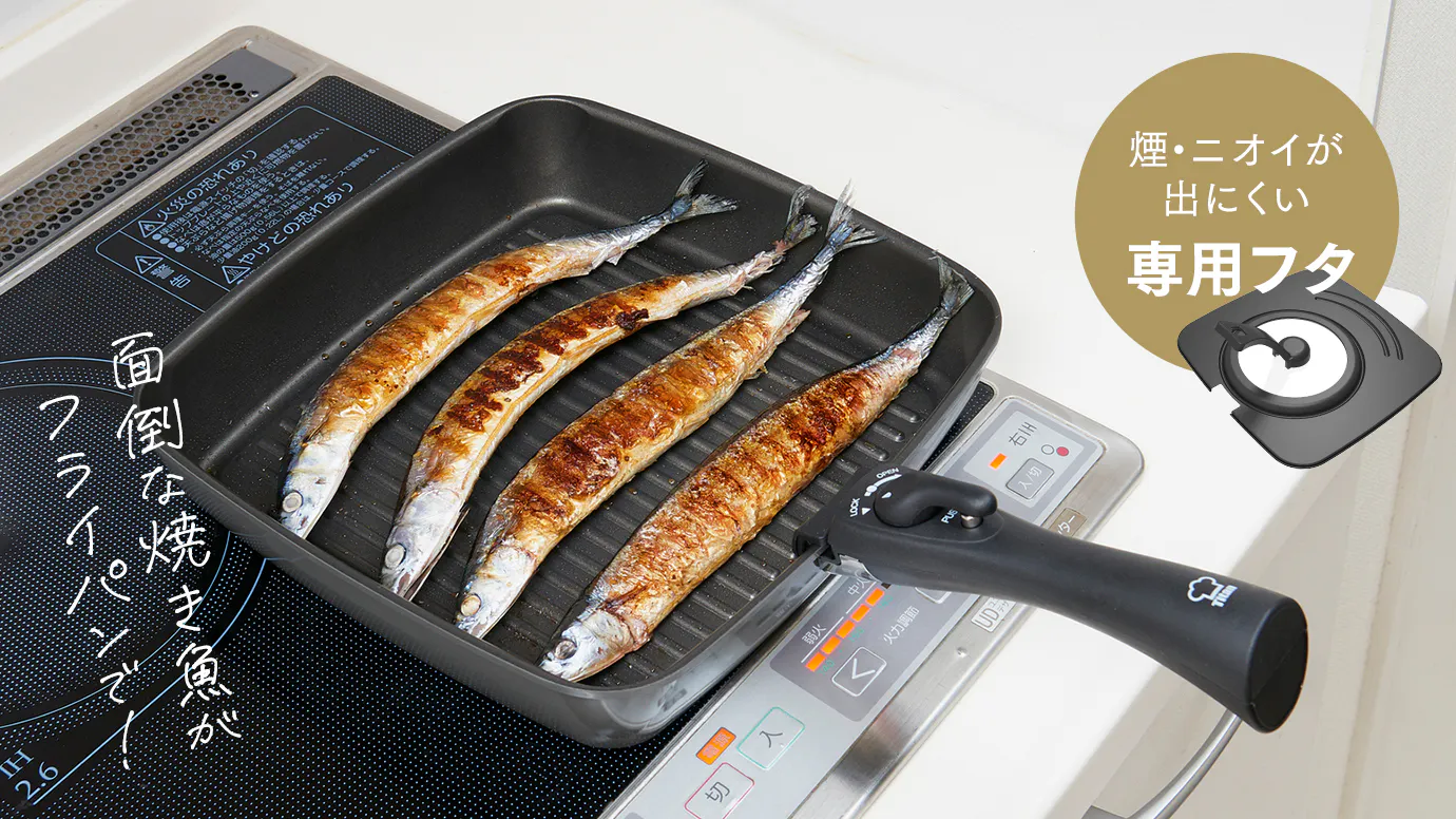 専用の四角いフタがあるので、魚を焼くときのニオイや煙も軽減できます。