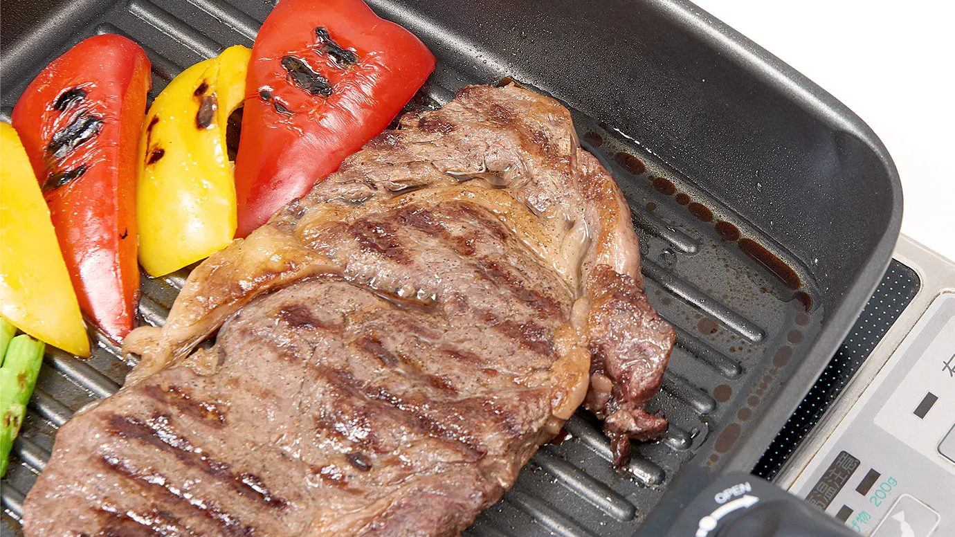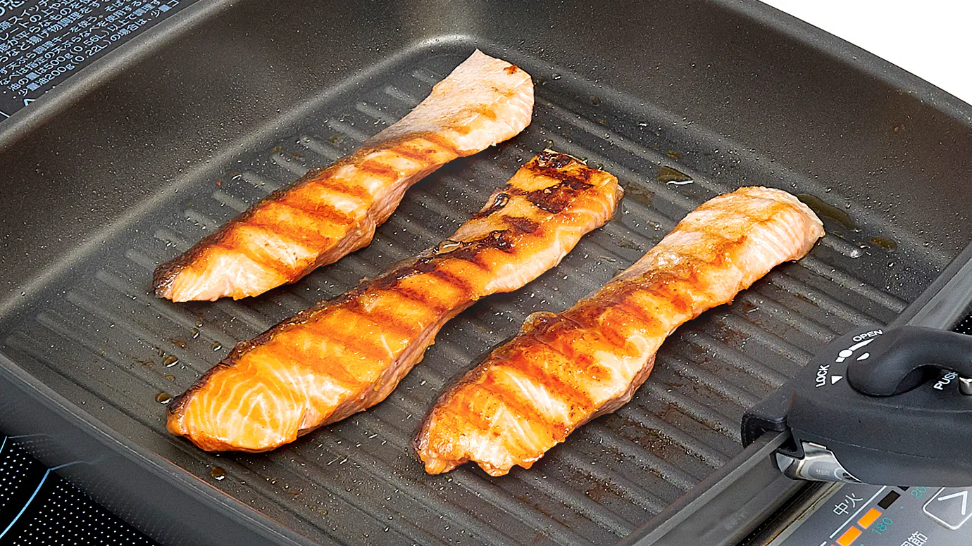 焼き面に波のような凹凸があるので、食材にきれいな焼き目をつけることができます。余分な油を落としながらヘルシーに調理できるのも魅力です。深さがあるので油も飛び散りにくい!