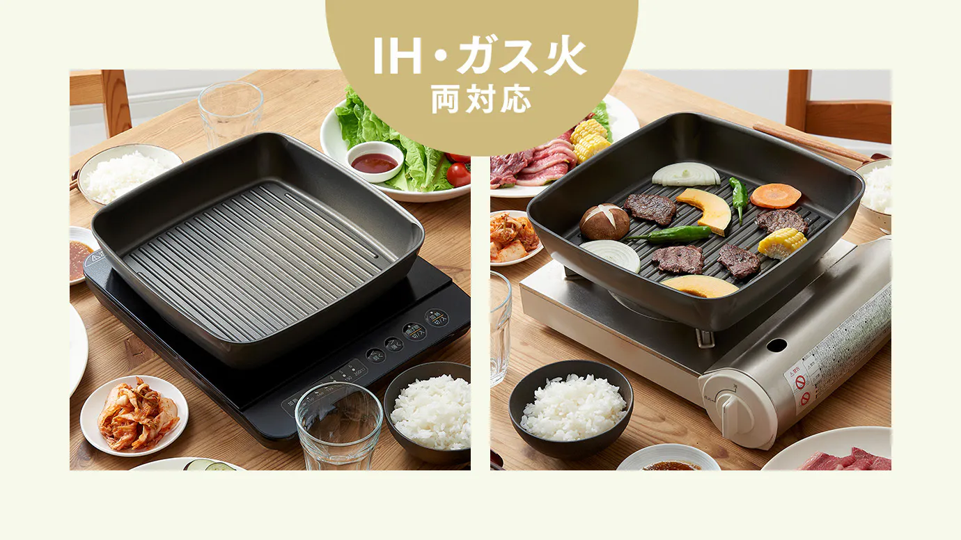 IHとガス火どちらにも対応しているので、卓上IHコンロでも卓上ガスコンロでも調理可能。コンセントの有無に左右されず、食べたい場所で焼肉が楽しめます。