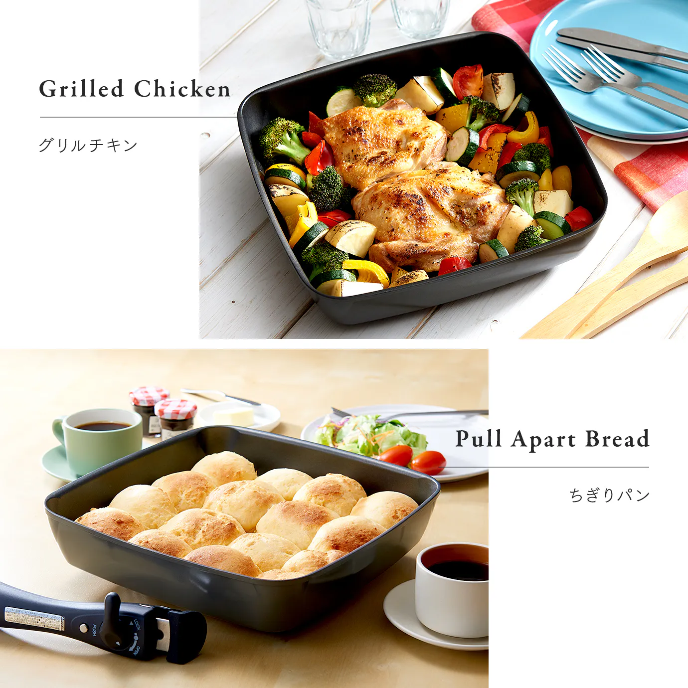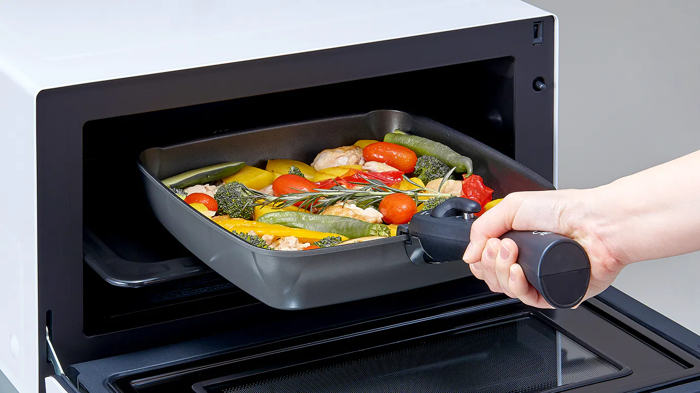 取っ手を外せばオーブン調理も可能!食材に味付けをしてオーブンに入れるだけで、簡単にパーティーにも映えるメニューができちゃいます。