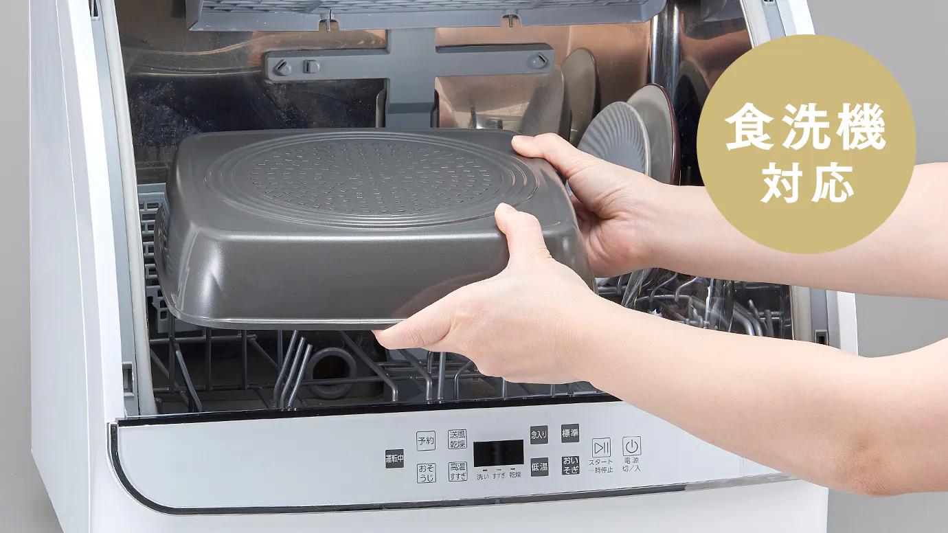 スクエアパンは食洗機で洗えるので、面倒な後片付けもラクラク。油汚れでベタベタになりがちな焼肉あとのプレートも、もう怖くない!