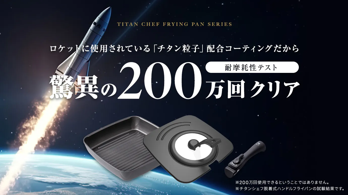そのチタン粒子をフッ素と混ぜ、フライパンにコーティングをしました。焦げ付きにくいから汚れもサッと落とすことができ、お手入れも簡単。チタンコーティングは耐摩耗性に優れており、耐久性が高いので長く使用することができます。