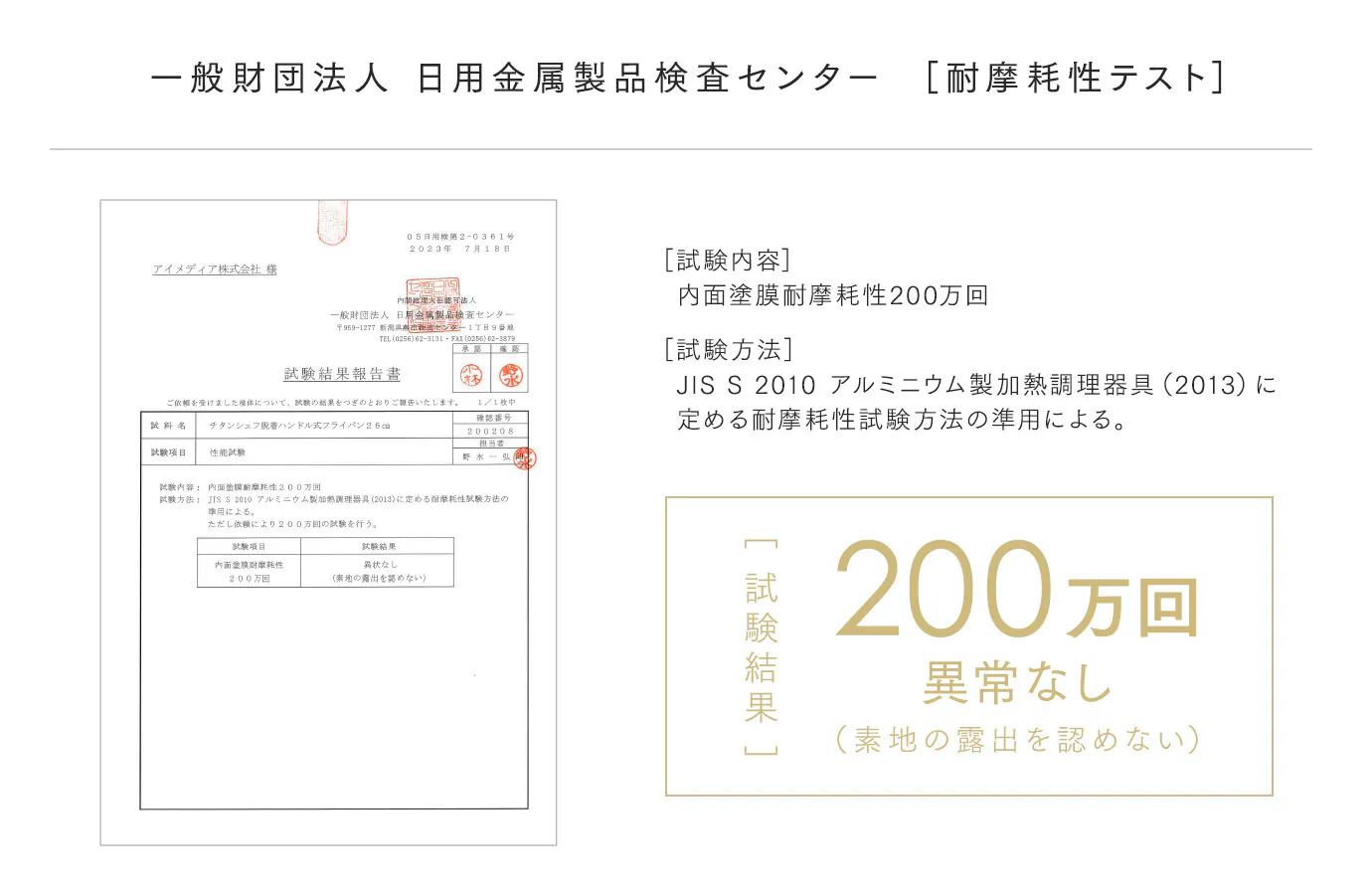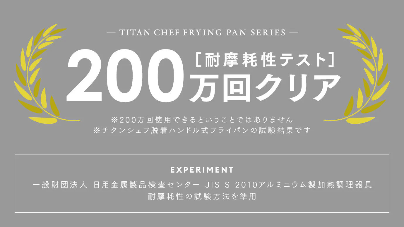 日本国内の正式な検査機関である、一般財団法人 日用金属製品検査センターによる「耐摩耗性テスト」で200万回をクリア。高いコーティングの耐久度を実証しました。
