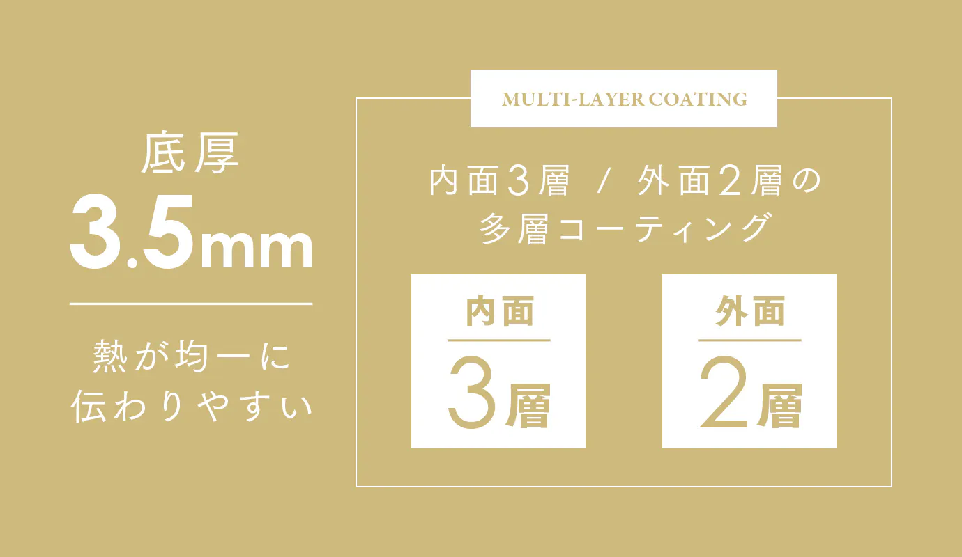 底厚が3.5mmと厚みがあるため、熱を十分に蓄え均一に伝わりやすく調理が安定。保温力・蓄熱性に優れており熱伝導率が高いため、底面全体を均一の温度にすることで美味しく調理できます。