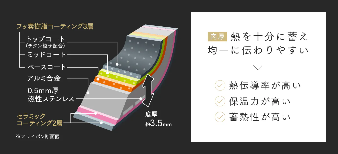 チタン配合で耐久性も強化した「こだわりの多層構造」。頑丈で熱変形がしにくいフライパンです。