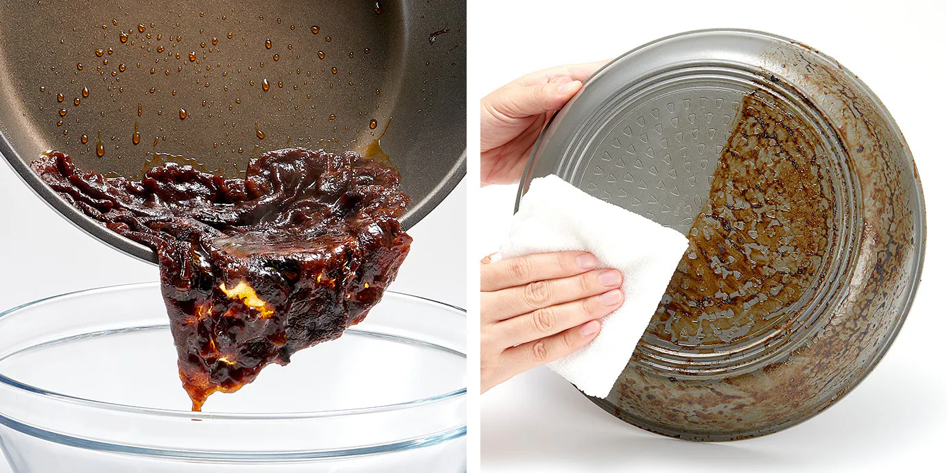 【A】 使用後は、柔らかいスポンジに食器用洗剤をつけて早めに洗浄し、よくすすぎ、十分に乾燥させて下さい。漂白剤等によるつけ置きや、クレンザーや研磨剤、焦げ落とし用のスポンジ等は使用しないでください。