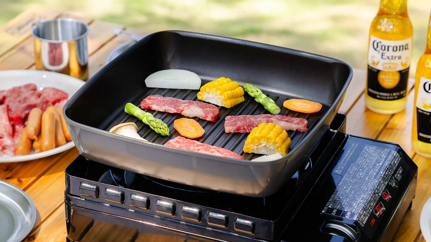 取っ手が取り外せる、ちょっと大きめサイズの四角いグリルパンがあれば、いろんな料理をもっと手軽に楽しめる!ホットプレートみたいに使うこともできます。