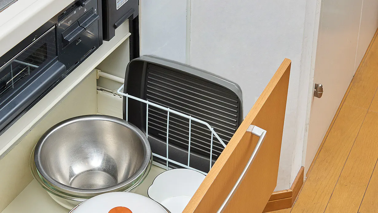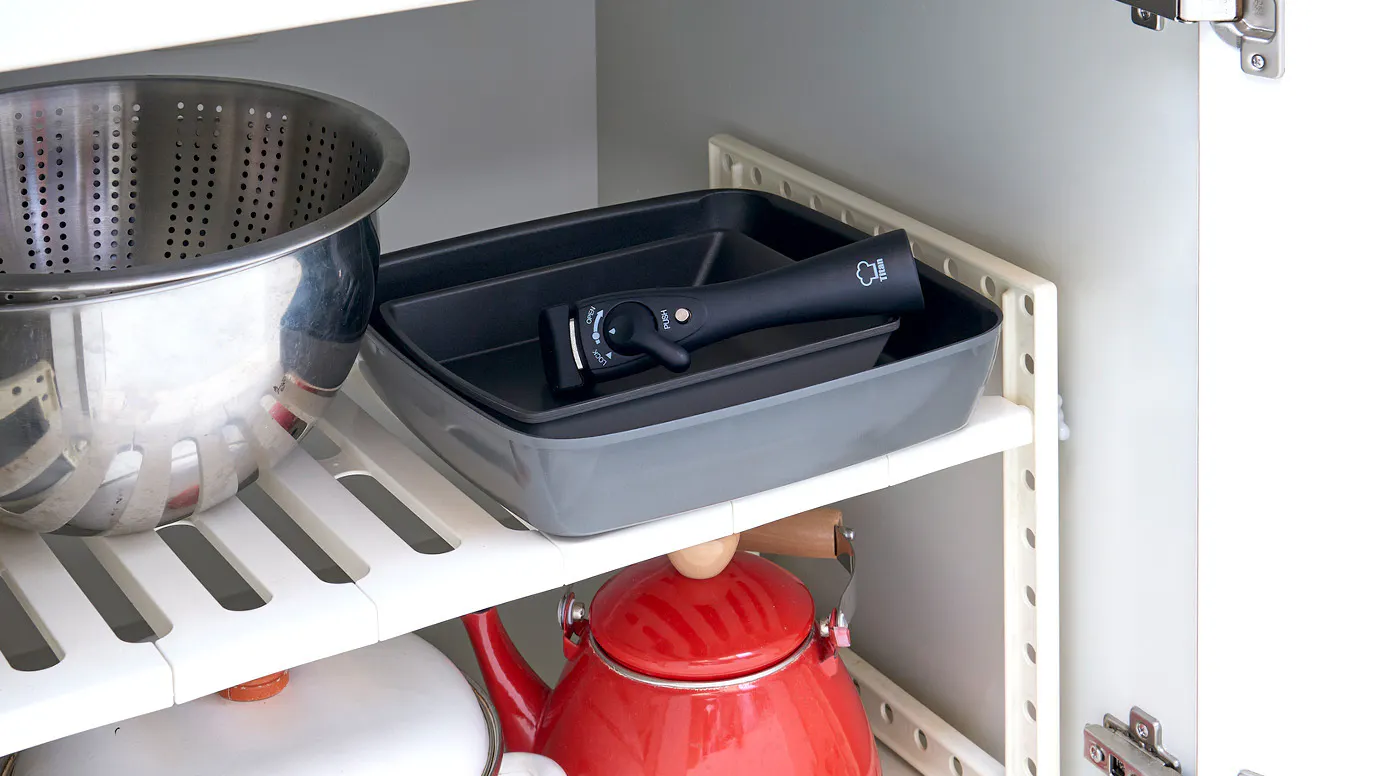 四角いフライパンだから、立て掛けて収納もOK!キッチンのすき間にスッと収まり、コンロ周りの空きスペースにも置けるので、限られたスペースを有効活用できます。