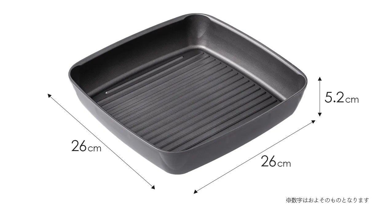 約26cm角のワイドサイズで、大きな秋刀魚もそのまま焼ける!デットスペースの少ないスクエア型だから、家族分まとめて美味しくグリル調理ができます。