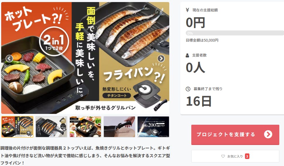 2024/06/14 15:52Campfireサポーターの皆様初めまして、aimedia_officialです!この度「食後の片付け革命!面倒な2トップ『魚焼きグリル×ホットプレート』融合フライパン」プロジェクトスタートしました!16日間、スタッフ一同頑張ります!皆様、ご支援のほどよろしくお願い致します!aimedia_official もっと見る