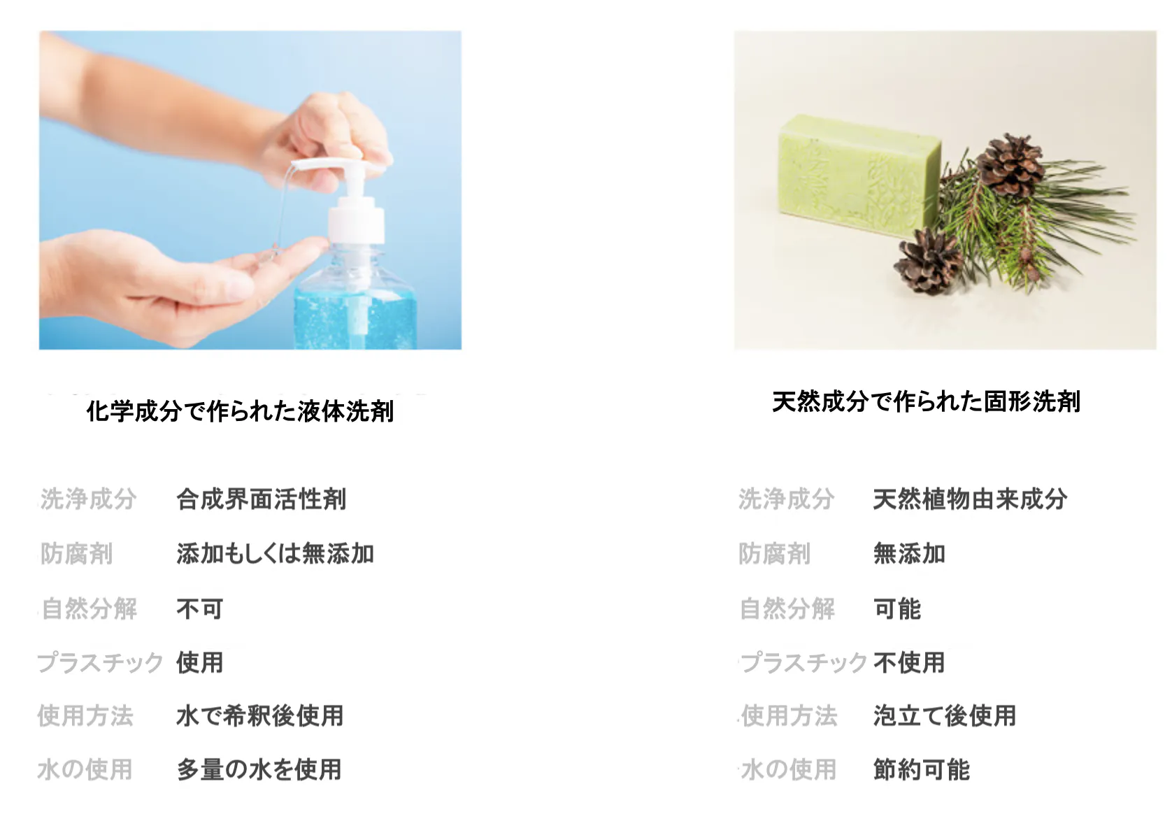 毎日各家庭や飲食店で流される排水には、界面活性剤を始めとした汚染物質が大量に含まれ、川や海に流れ出ています。また、洗剤ボトルや詰め替えであっても、プラスチックのゴミが一定量発生します。