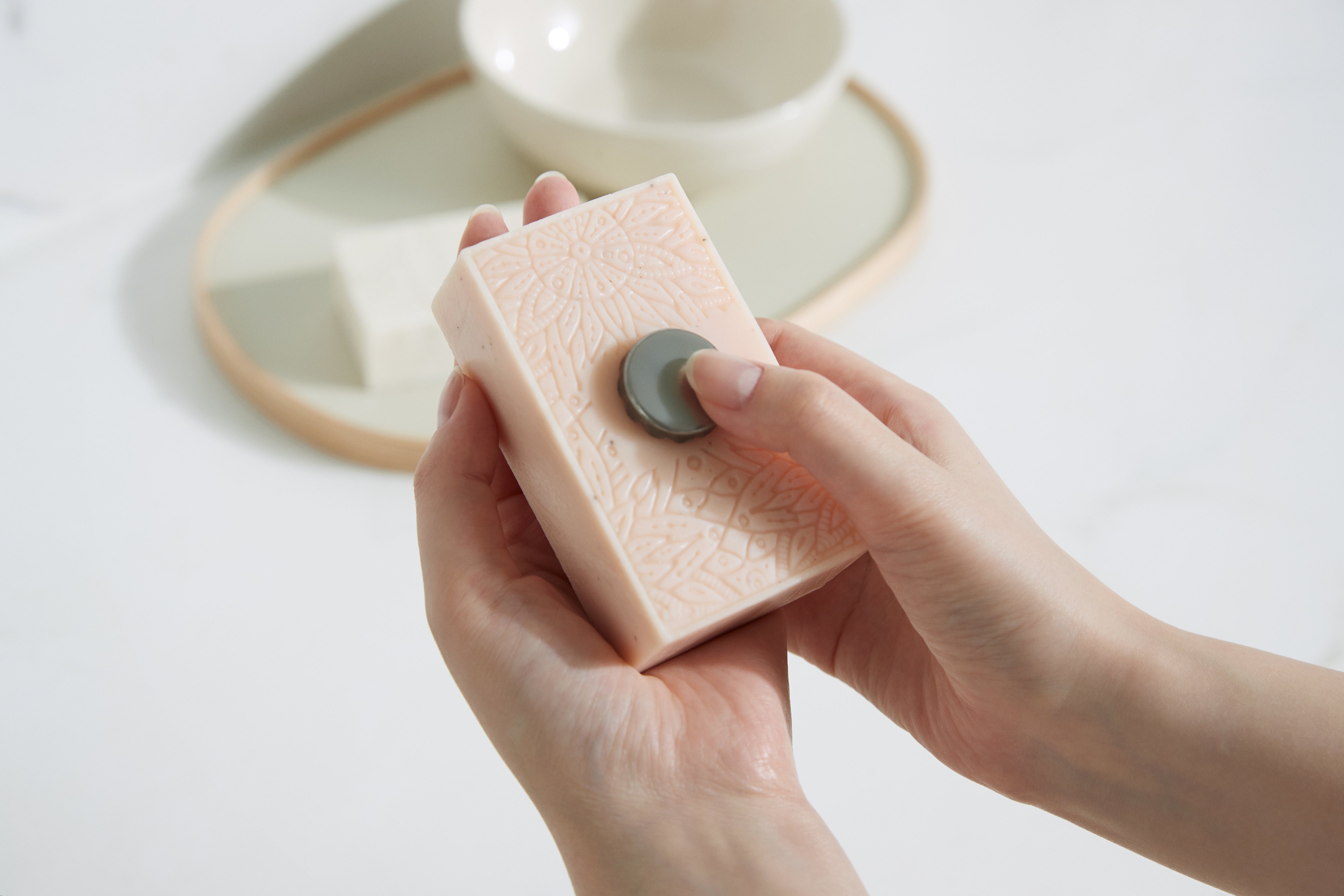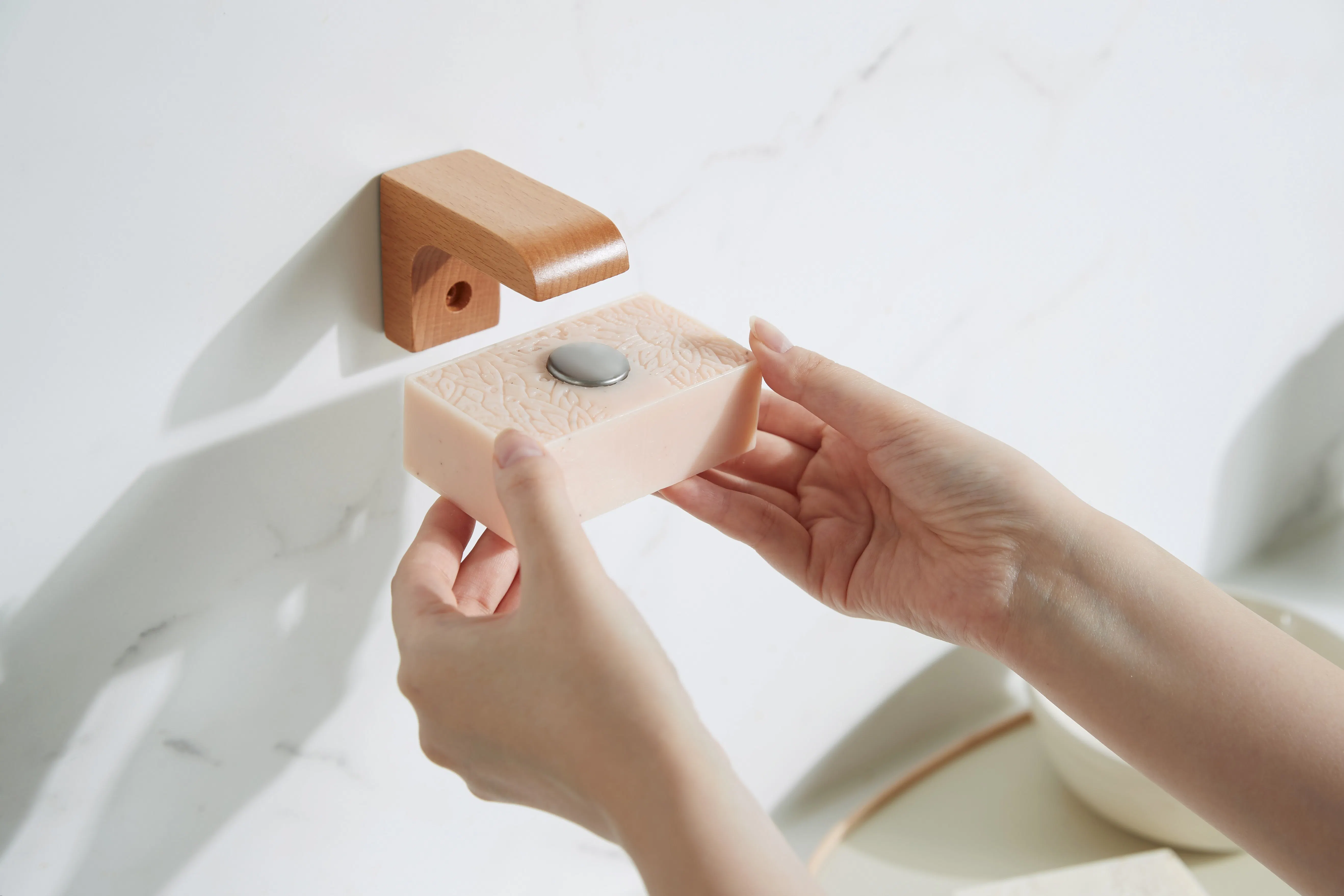 ・専用留め具:両面テープが付属しており、壁に簡単に接着できる留め具です。マグネットを埋め込める石鹸全般でご使用いただけます。
