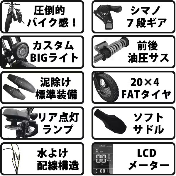 その他の部分(サドル、ペダル、タイヤ、ハンドル、メーター、ブレーキ、配線等)は基本的に全て保証対象外となります。また、通常使用以外での故障も対象外となりますのでご了承くださいませ。
