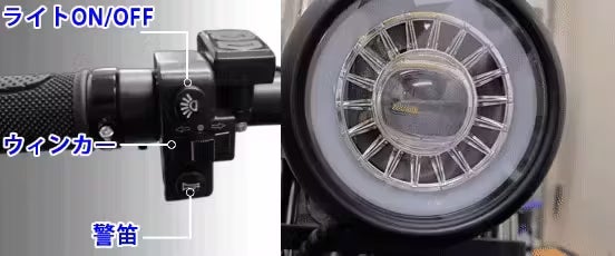 AWB01のヘッドライトは、バイクに使用されるヘッドライトをカスタマイズして搭載。