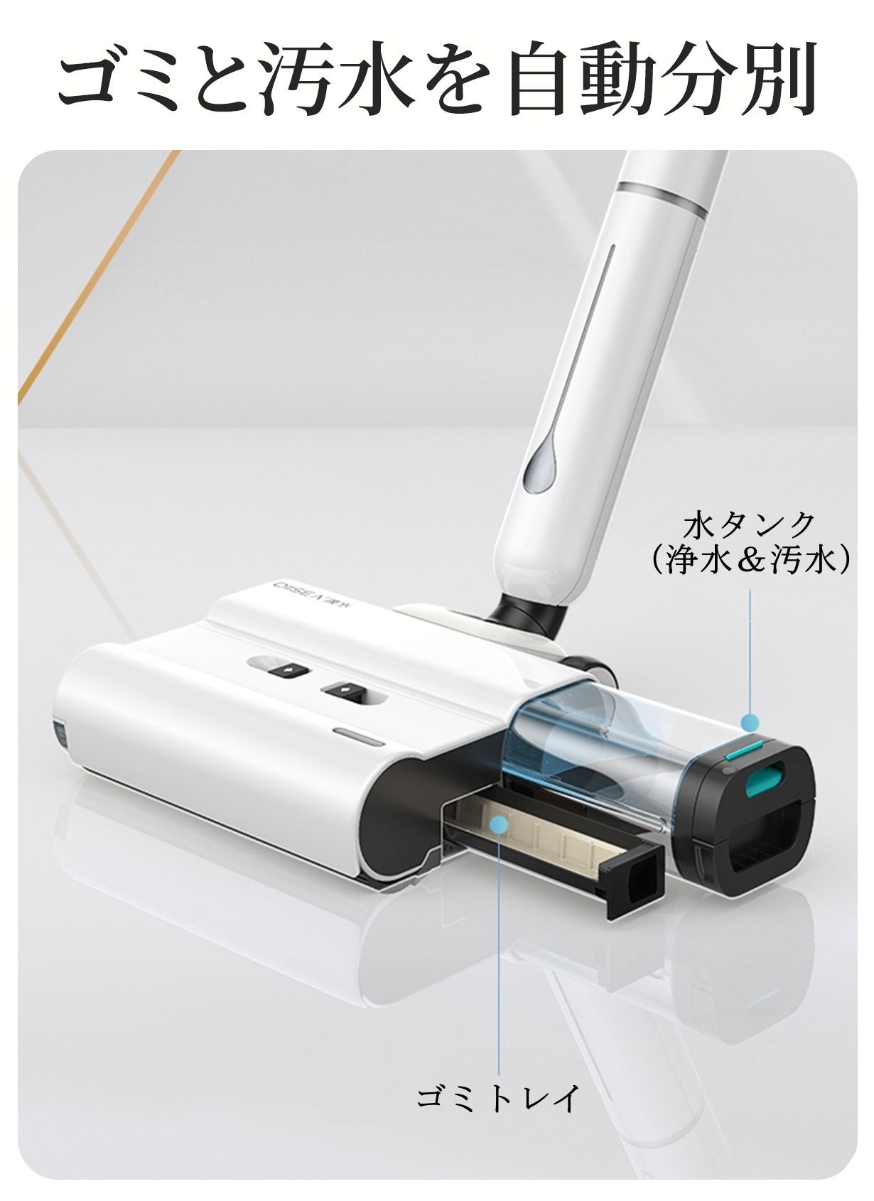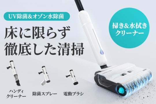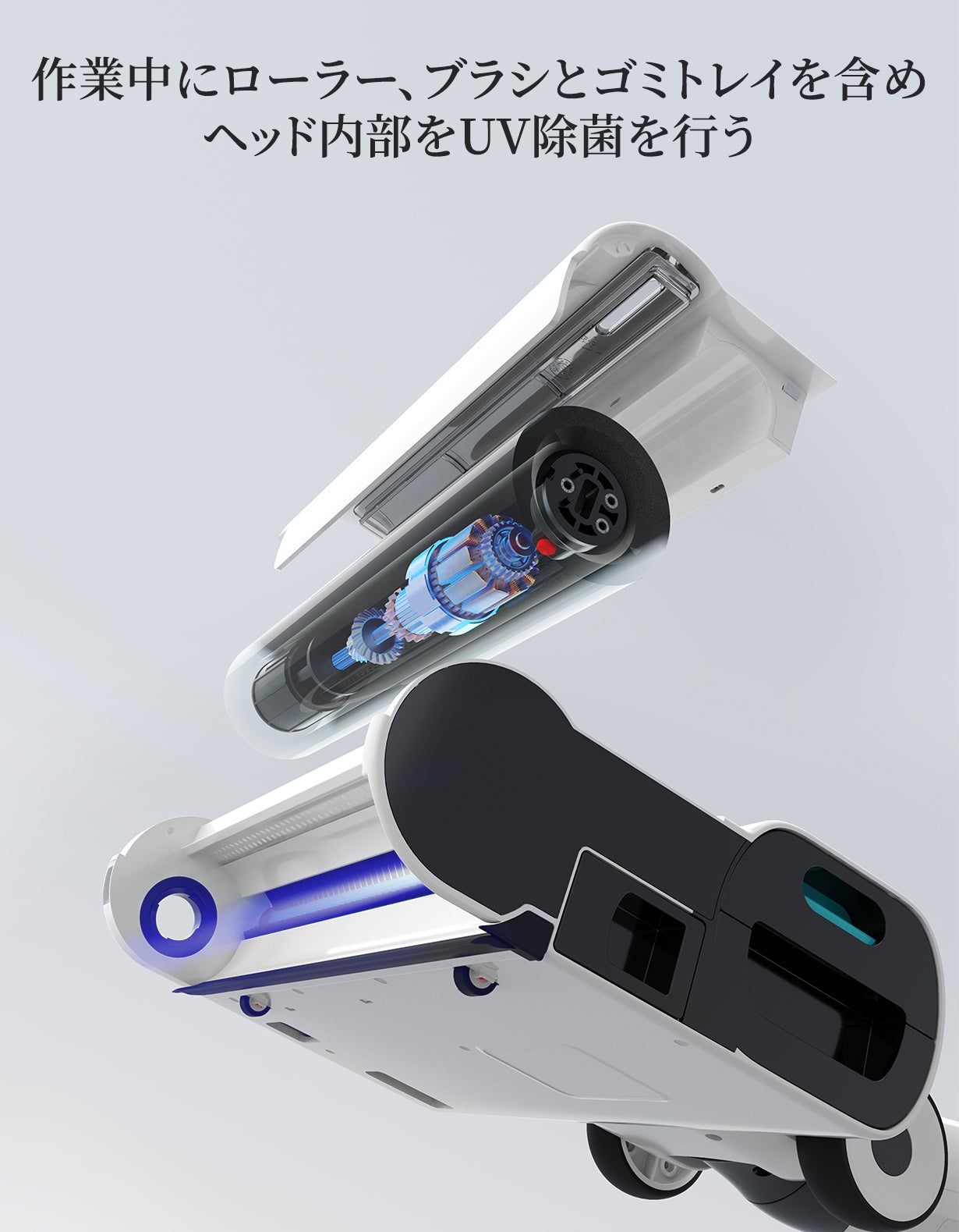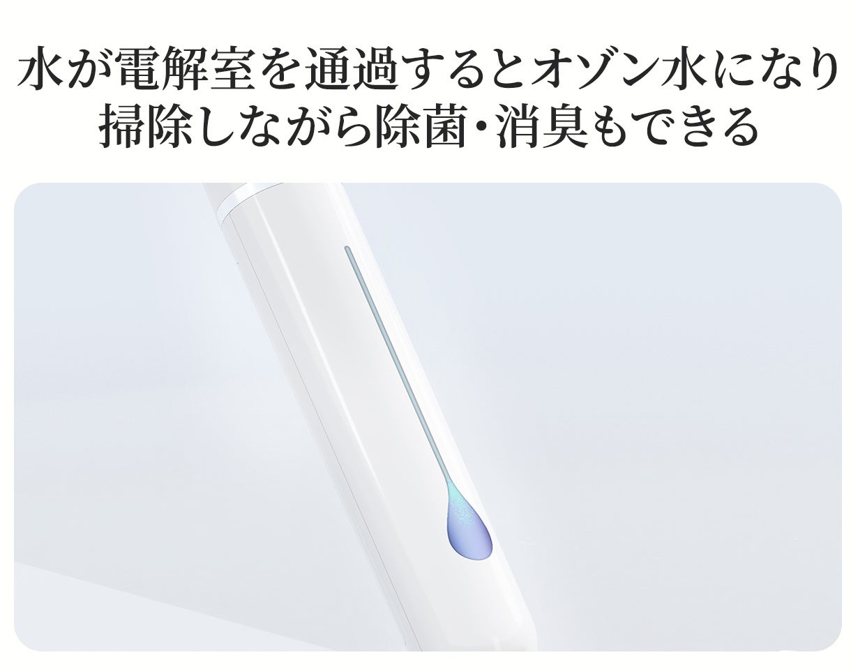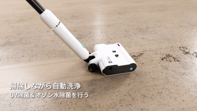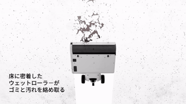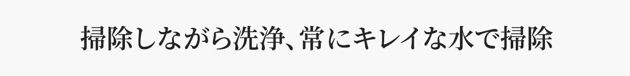 掃除しながらモップを自動的に洗浄するため、いつても洗い立てのモップで水拭きができます。洗浄だけではなくUV除菌も行い、汚れたモップによる二度拭きを徹底的に防ぎます。