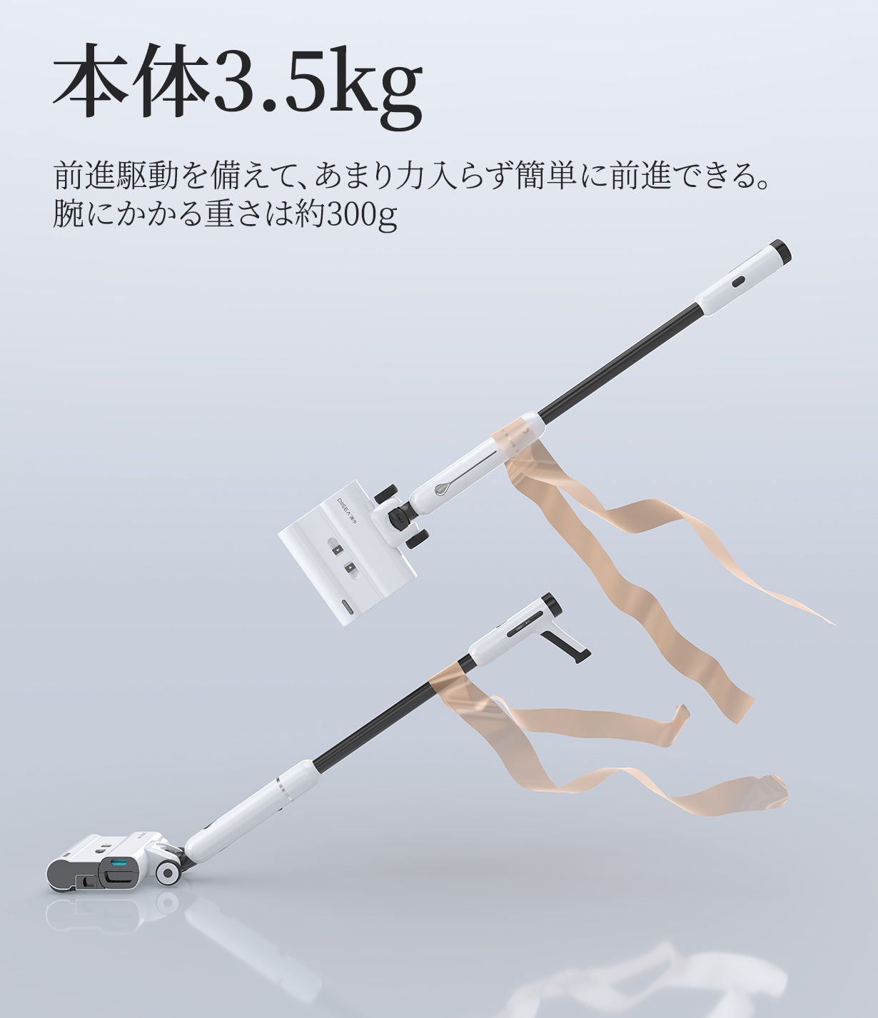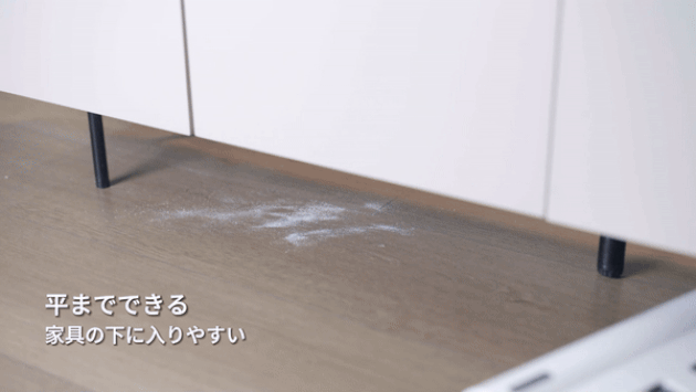 ハンドル、延長管とモーターの部分は地面と平行になるまで完全に傾けることができるので、家具下の隙間に入り安く、隙間の奥まで届くことも可能です。