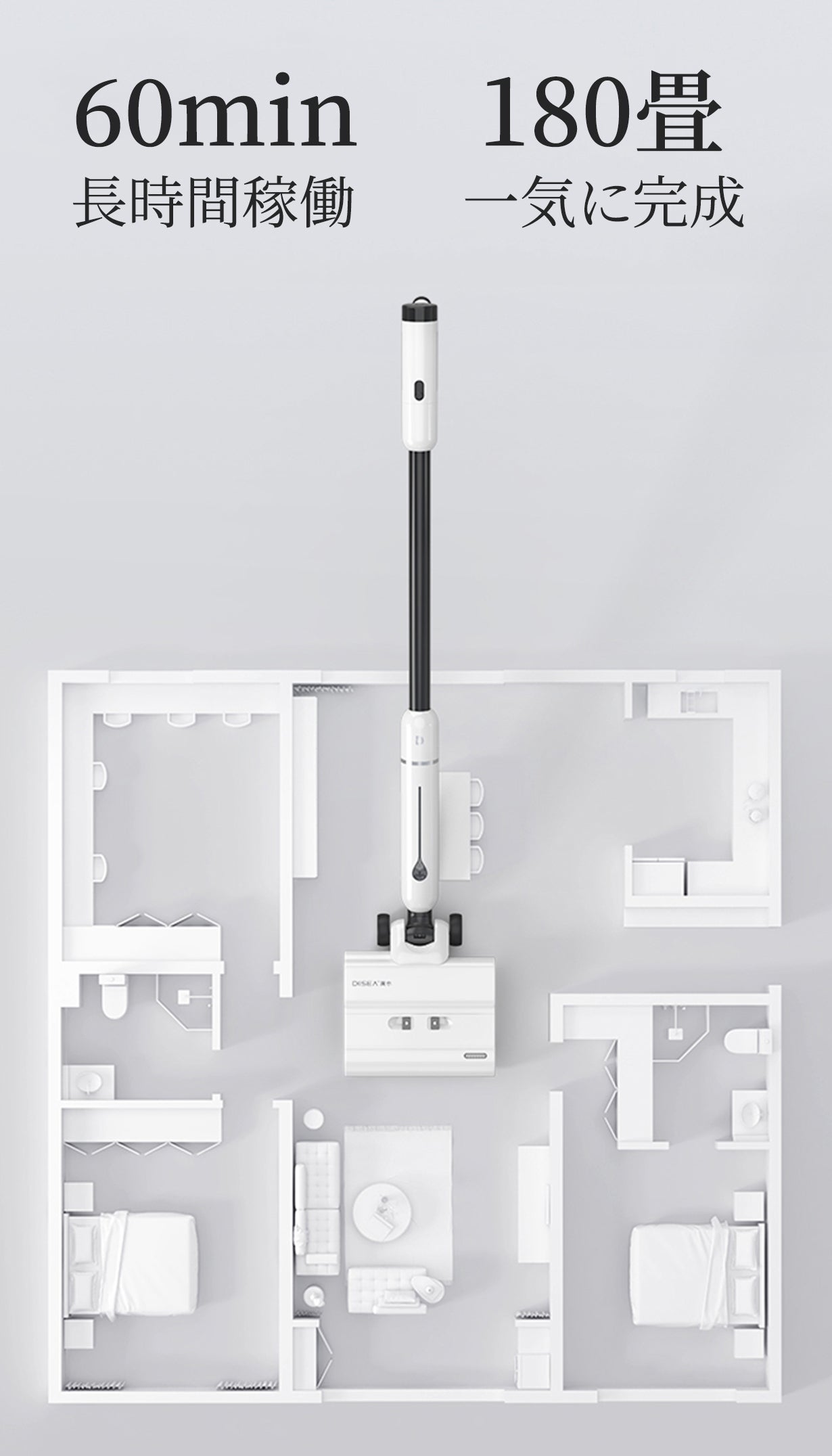 吸引式ではないので、出力を抑え、稼働時間を長くすることができました。フル充電したあと最大60min使用でき、掃除中の電池切れを心配する必要なし!