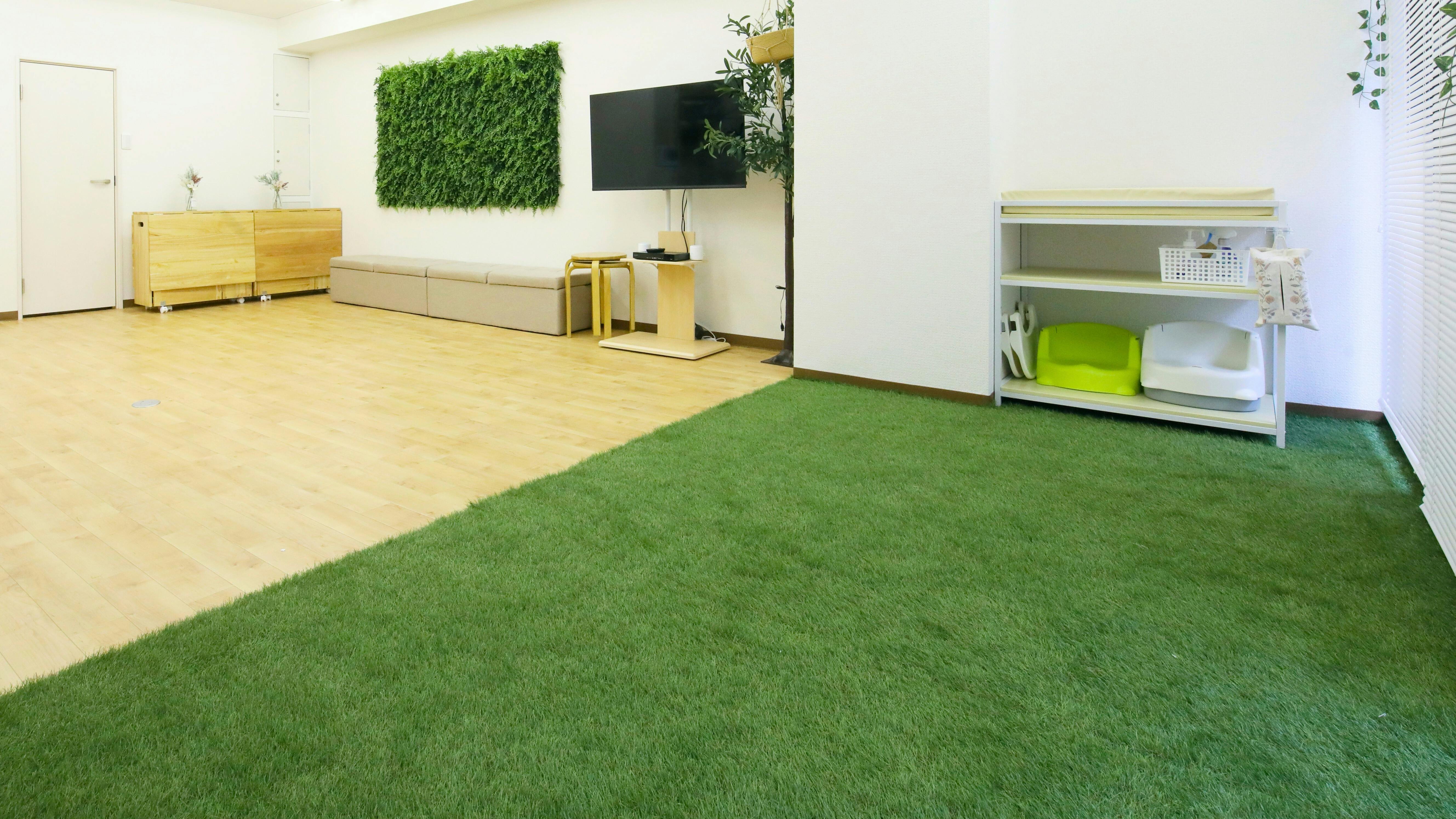 靴を脱いでくつろげるクッションフロアと人工芝をご用意。座卓スタイルで子供の食事などにも最適♪防水加工もバッチリです。屋内なのにグリーンに癒され、ピクニック気分を味わうことができます。