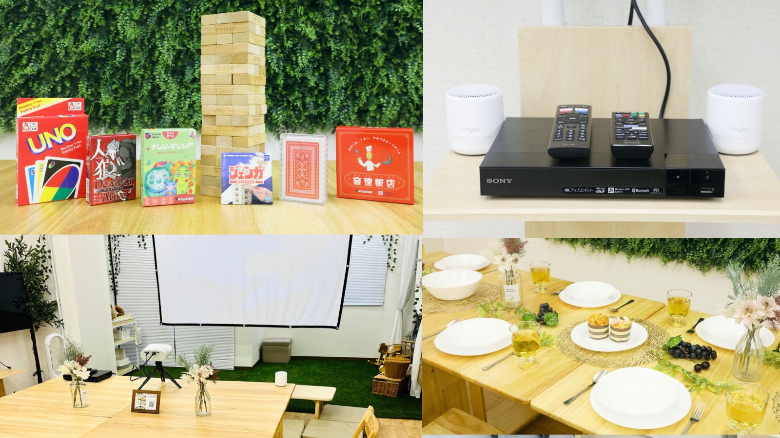 童心を呼び起こす!子供と楽しめるカードゲームやジェンガをご用意。驚くほど白熱します♪ぜひやってみてください。テレビ&100インチの大画面プロジェクターにDVD・Blu-rayプレーヤーもご用意しています◎子供との映画視聴としても、推し会・鑑賞会・上映会・ライブ配信などにもご利用いただけます。