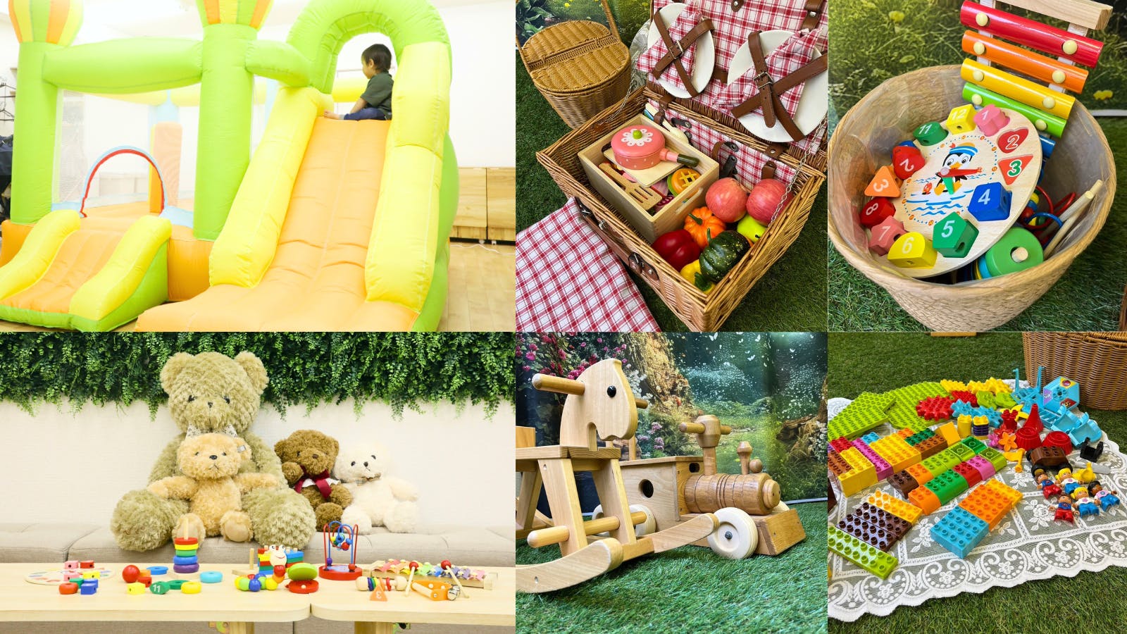 木製のおもちゃからLEGOなどの知育玩具、おままごとセットにエアー遊具まで!小さいお子さまから、大きくなって身体を動かすのが大好きなキッズ達も飽きずに遊べるおもちゃをご用意しています。