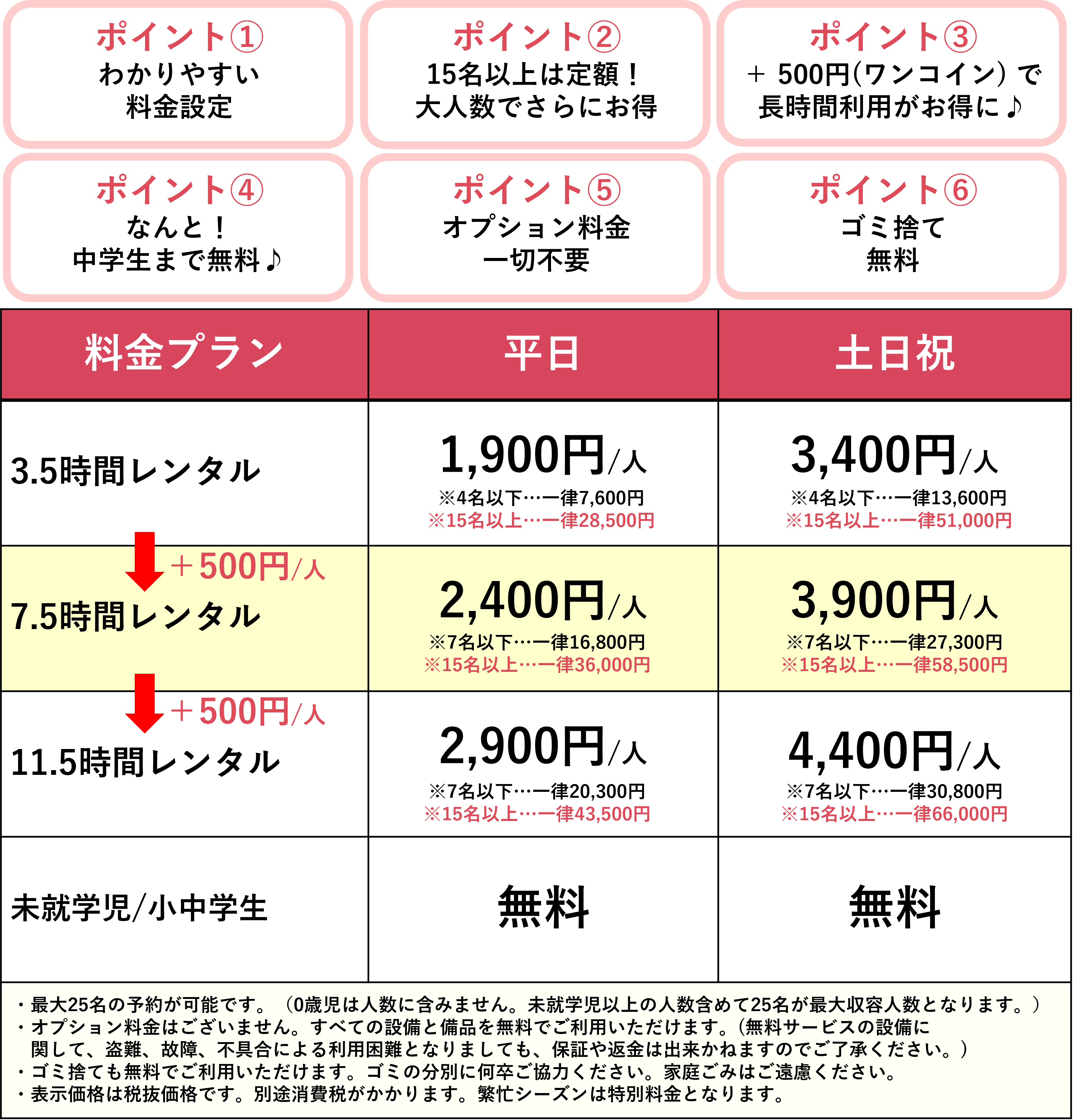 人数料金ですと、価格が明瞭である点はメリットですが、大人料金・子供料金がかさんで子供が多いほど高額になりがちです。時間貸しは大人数の利用がメリットである一方で、少人数での利用が高額になりがちです。私たちがつくるサイトでは何度も議論を重ねて、少人数でも安く借りられる良心的な価格提供ができるように「少人数は人数料金」で。大人数利用は「15人以上の料金は定額性」にして、人数が多ければ多いほど1人あたりの金額が安くなるように設定しました。人数料金×定額料金のハイブリット型の料金プランにすることで、少人数でも大人数でも価格が負担にならない料金プランにすることができました。また子供料金ですが、多児育児の方にこそ使っていただきたい想いから中学生まで「無料」にしています。※未成年のみのご利用不可。