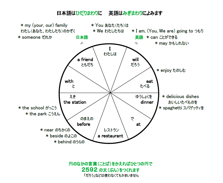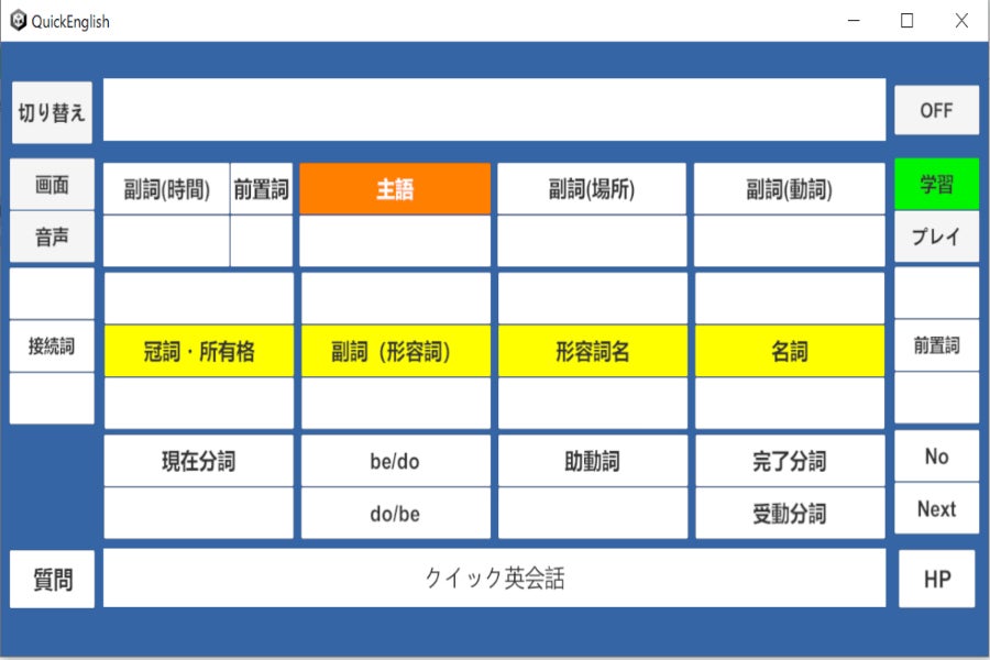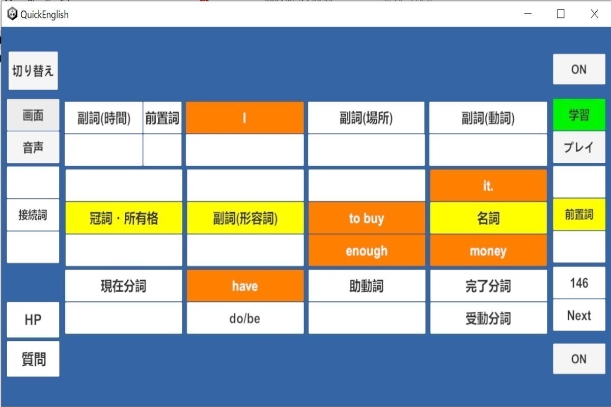日本語と英語の同じ品詞「主語・動詞・助動詞・完了・冠詞・所有格・(形容詞用)副詞・(時制用)副詞・(場所用)副詞・(動詞用)副詞・使役動詞・知覚動詞・不定詞・動名詞・現在分詞・過去分詞(完了分詞と受動分詞と表示しています)・仮定・関係詞・疑問詞・it that 構文・it to 構文・ so that 構文」を含め、英文法で構成されたほぼすべての日本語の「単語」と「文」を英語と同時に知ることが可能です(学習ボタン)。画面トップの日本語の単語を英文のアレンジメント順に正確にクリックしていけば英文が正しく表示されます(プレイボタン)。最初は英文を見てプレイすることをお勧めします。