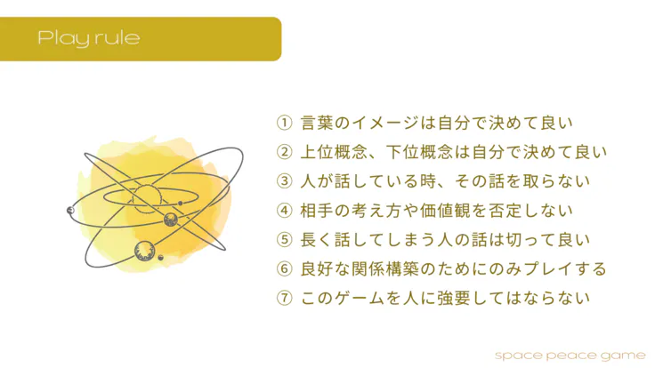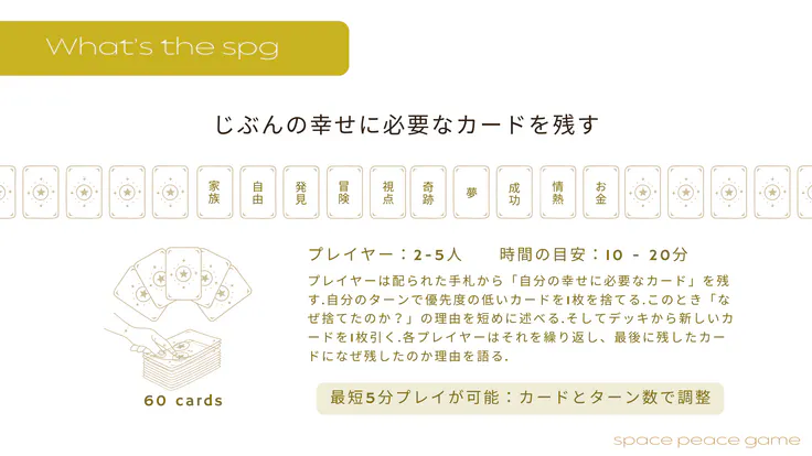 【世代を超えて盛り上がる、価値観カードゲーム】 人類の平和が見たいという熱い思いから、 宇宙ビジネス実践コミュニティ【ABLab(エービーラボ)】のメンバーとともに開発を進め、究極の価値観発見ゲームを完成させました!初めてのテストプレイでは、9人で6時間も盛り上がりました!