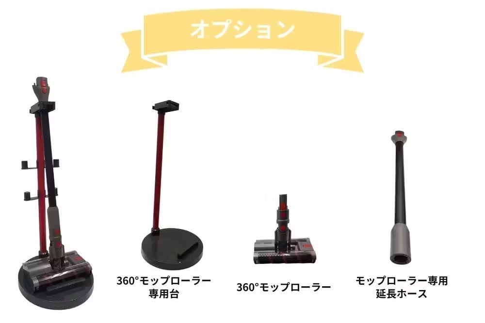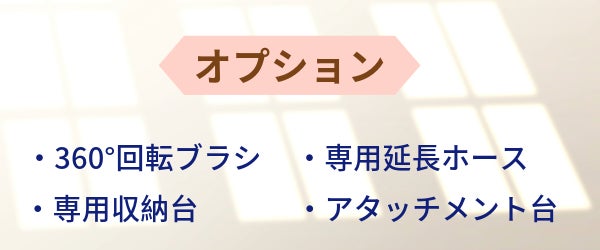 今回オプションとしてヘッドが360°回転するダブルローラーブラシ、専用延長ホース、専用の立てかけ収納代、アタッチメント置きをご用意しております。