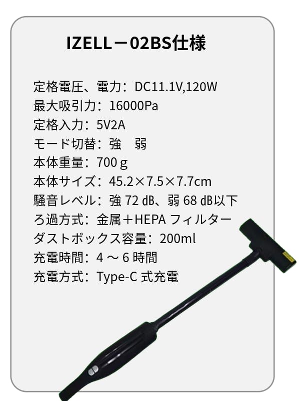 IZELL-Y02BSは、わずか700gの超軽量設計で、持ち運びが簡単でストレスフリーな掃除を実現。また、45.2×7.5×7.7cmというコンパクトな設計により、どんな場所にも楽々アクセスでき、家庭内での細かな清掃や、階段、高い場所、車の掃除などにも便利に使用できます。
