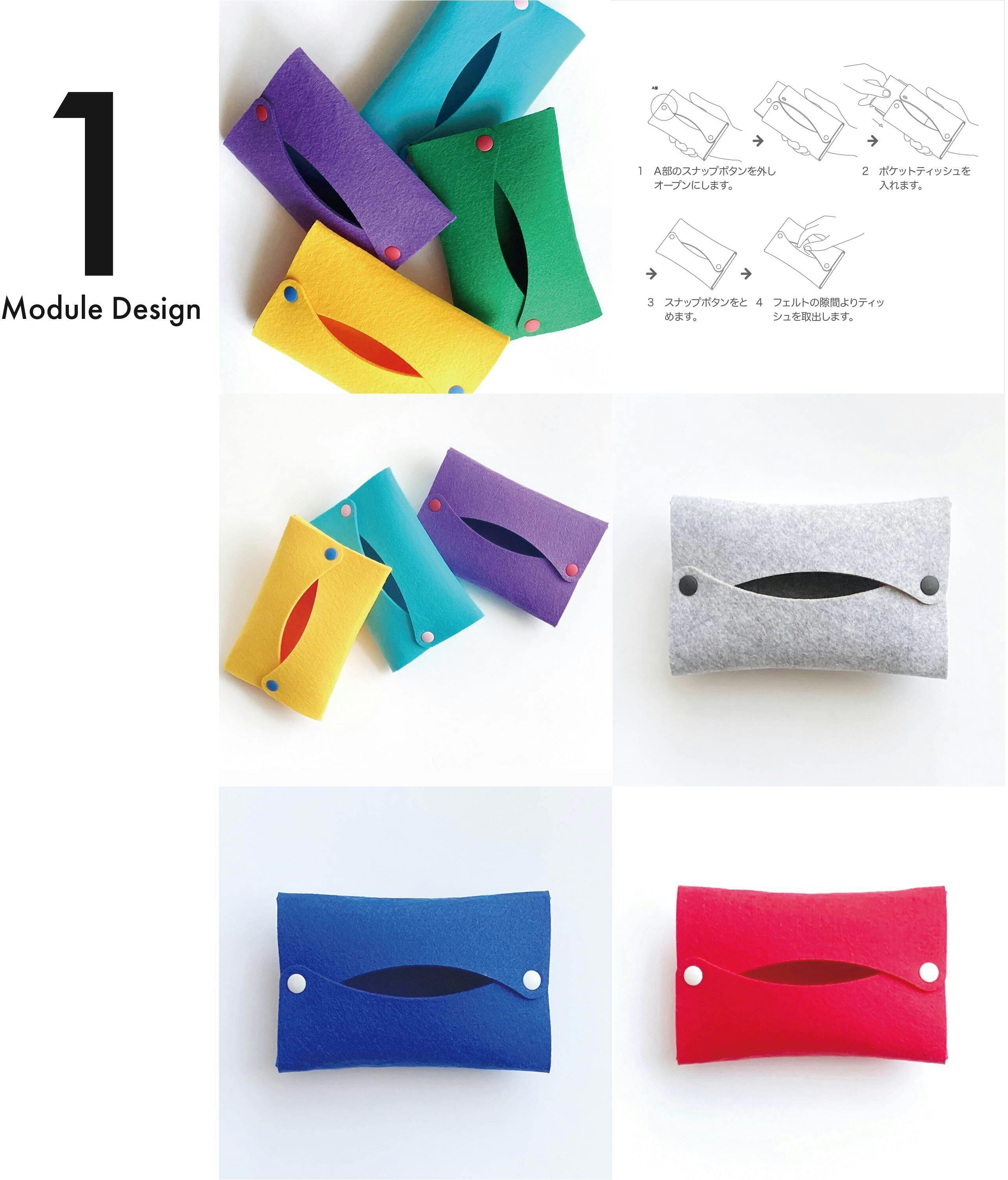 フェルト素材は以前から面のハリ、発色など量産で使用されるプラスチックと近いイメージがあり興味を持っていました。プロジェクトの当初からデータによるレーザー加工の試作製作にいち早くトライし相性の善し悪しを判断、さらにエシカルの配慮からポリエステル製のウォッシャブルフェルトを採用しました。結果、カット小口のメルト化によるほつれがなくなり,強度のアップを生みプロジェクトの可能性を前進させました。フェルトはフレキシブルで立体にすると、ほっこりとした立体面も魅力で小物雑貨のデザインに適した素材である可能性を感じました。また縫製加工はしないでボタン、差込などの工夫により立体を完成することで「シンプルでミニマル」、オリジナリティーの高い無駄のないアイテムのデザインが実現しました。さらに簡単にフラットにでき洗濯も容易です。