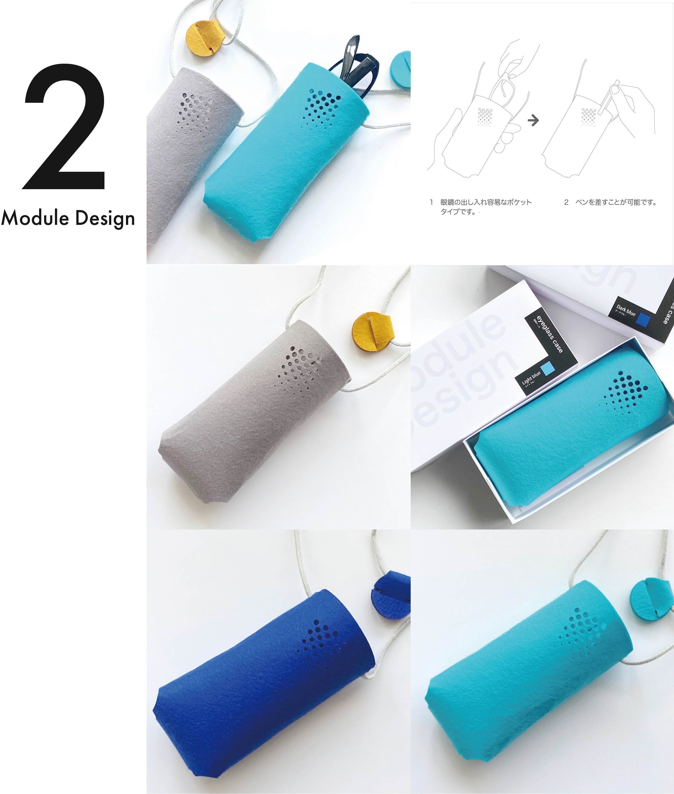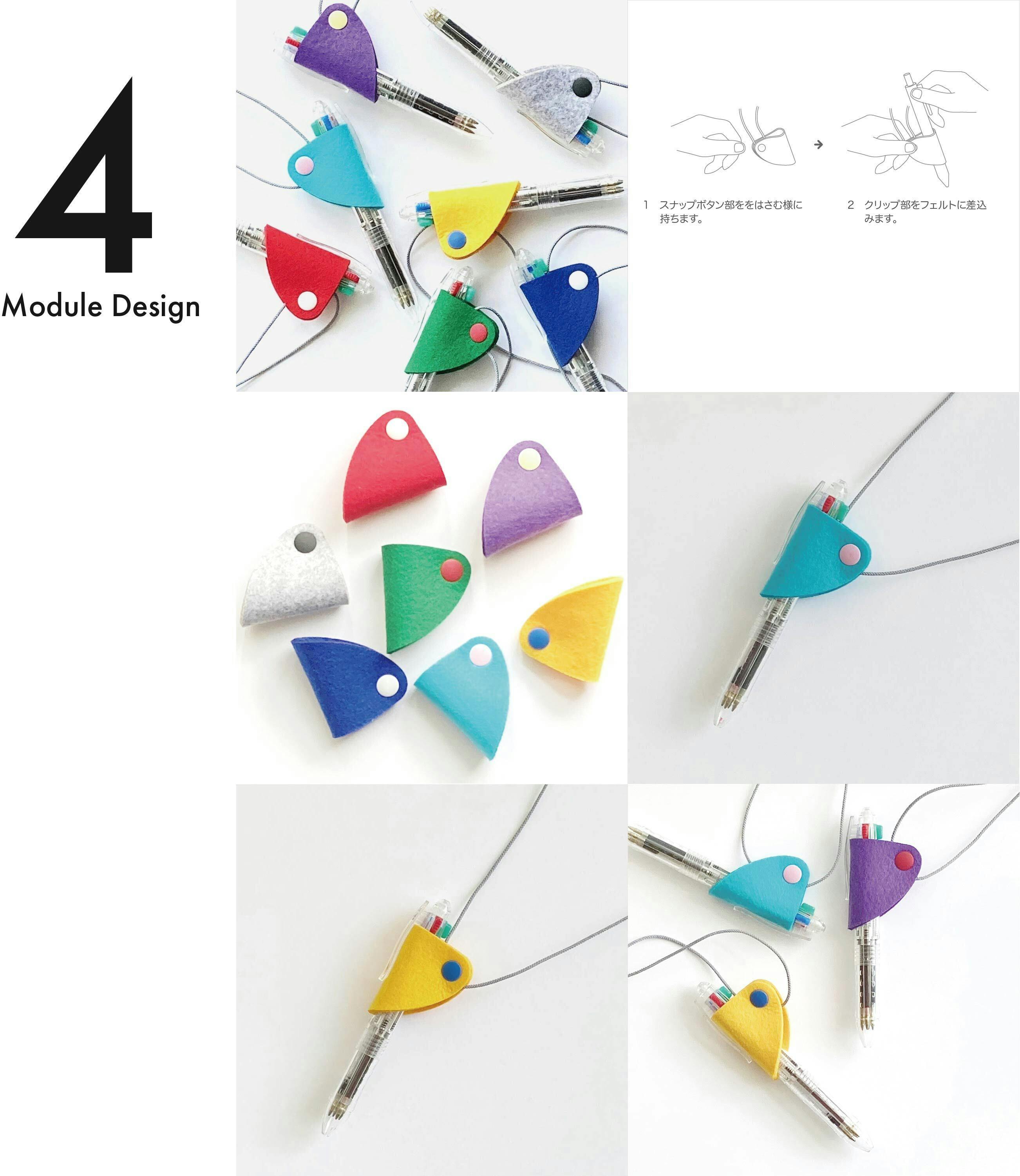 フェルトの物理的特性としてふわっとした「軽さ」が上げられます。この特徴はペンホルダー、眼鏡ケース、ペンダントなど首さげタイプのアイテムを実現し,ストレスフリーの快適さも得ることができました。思わず触ってみたくなる優しくソフトな素材感とビビットな発色の良さは「元気になる」楽しくわくわく感をプラスします。