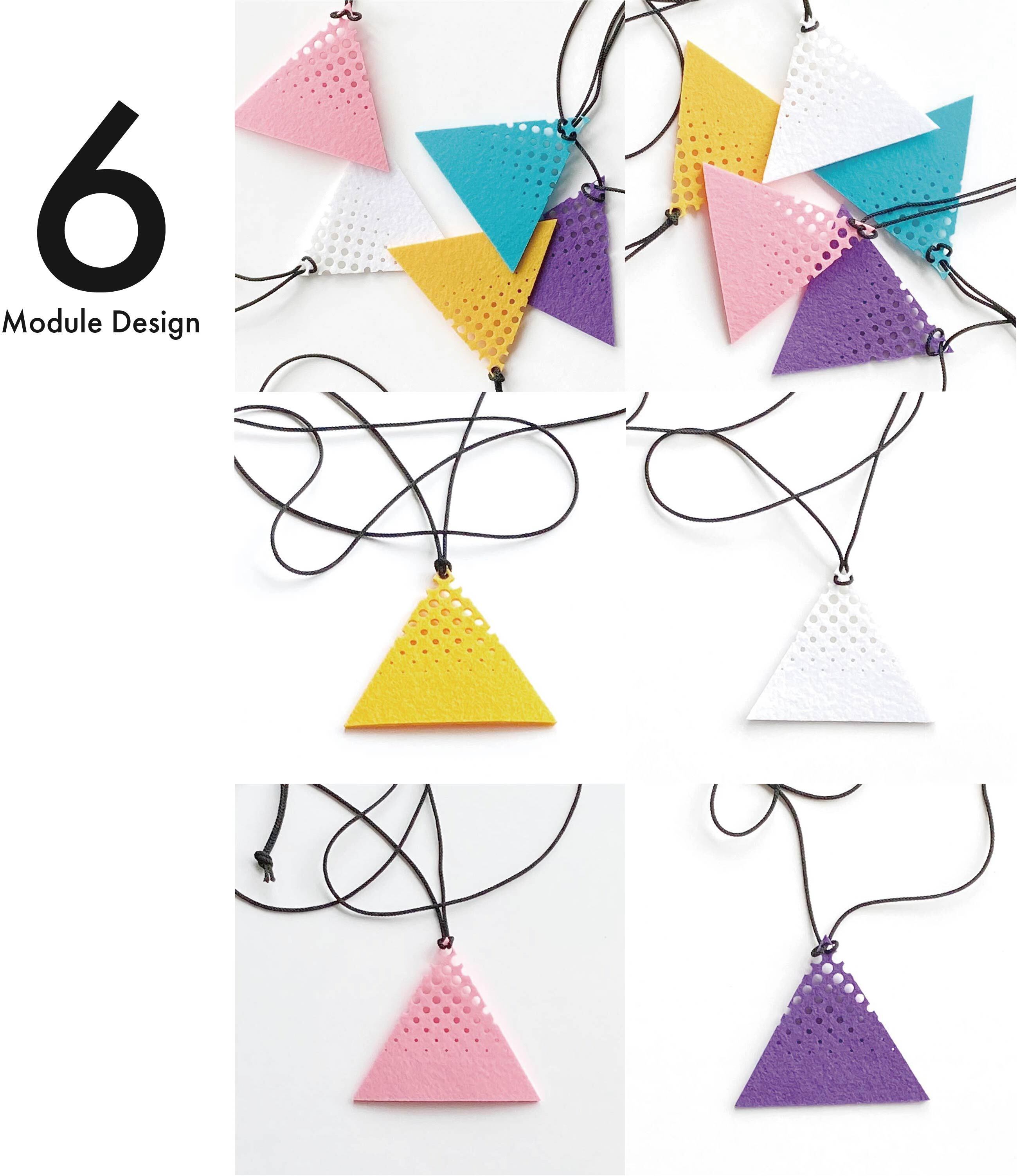 Tシャツなどカジュアルな装いのアクセントにデザインしたペンダント三角です。ベーシックな三角形とグラデーションのパターンはシンプルでさりげなく楽しむことができます。ウォッシャブルフェルトのペンダントは洗濯可能で清潔を保つことができ、軽いフェルト素材は着けたことによるストレスを感じません。5色の発色の良いカラーはプレゼントにもおすすめです。