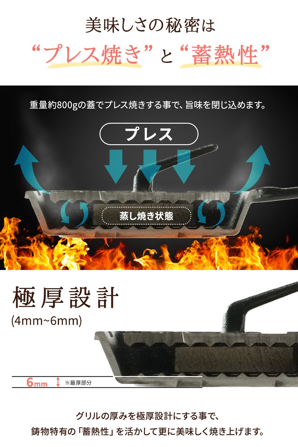 厚みを薄くして、軽くて使いやすいスキレットは世の中にありますが、敢えてグリルの厚みを6mm(最厚部)の極厚設計にする事で、鋳物特有の「蓄熱性」を最大限活かせる設計となっています