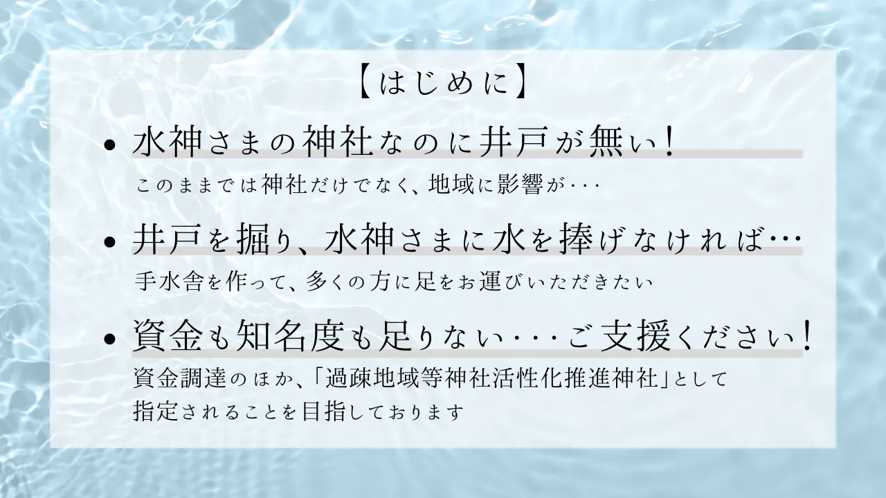 神社そのものだけではなく、温見(ぬくみ)の里の安寧と活性化のためにも井戸水を作り、水神さまに水を捧げるご協力を頂きたくお願い申し上げます。