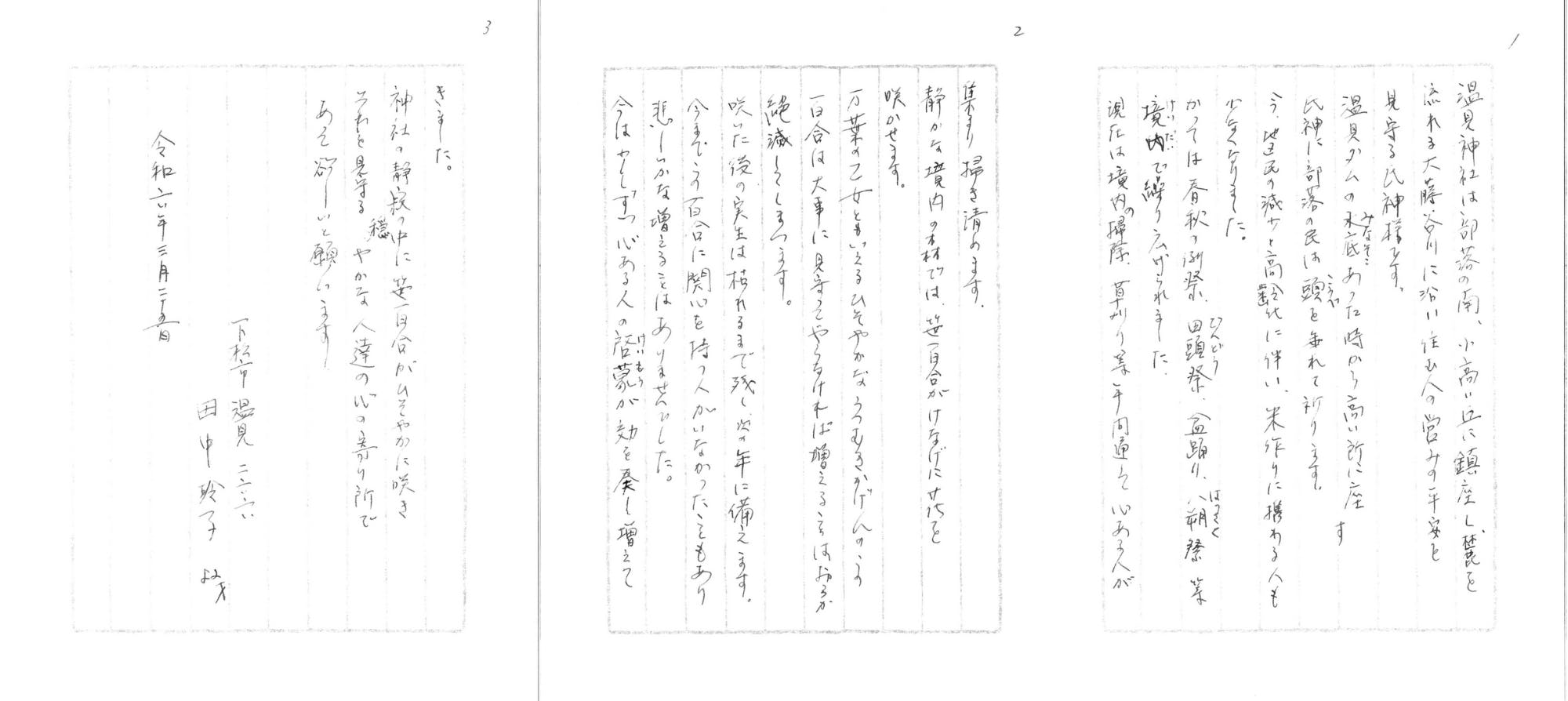 温見神社前宮司や、氏子代表、氏子の方々から温見神社への想いを綴ったお手紙を頂きました。