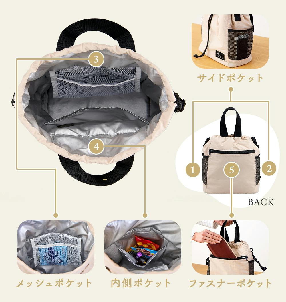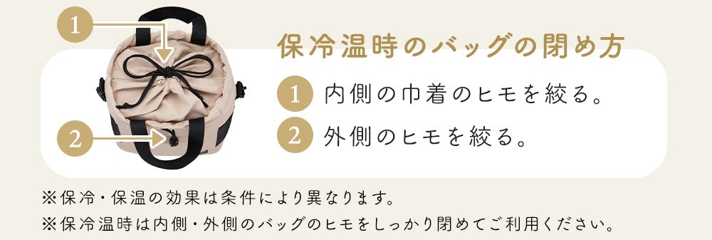 ※保冷温時は内側・外側のバッグのヒモをしっかり閉めてご利用ください。
