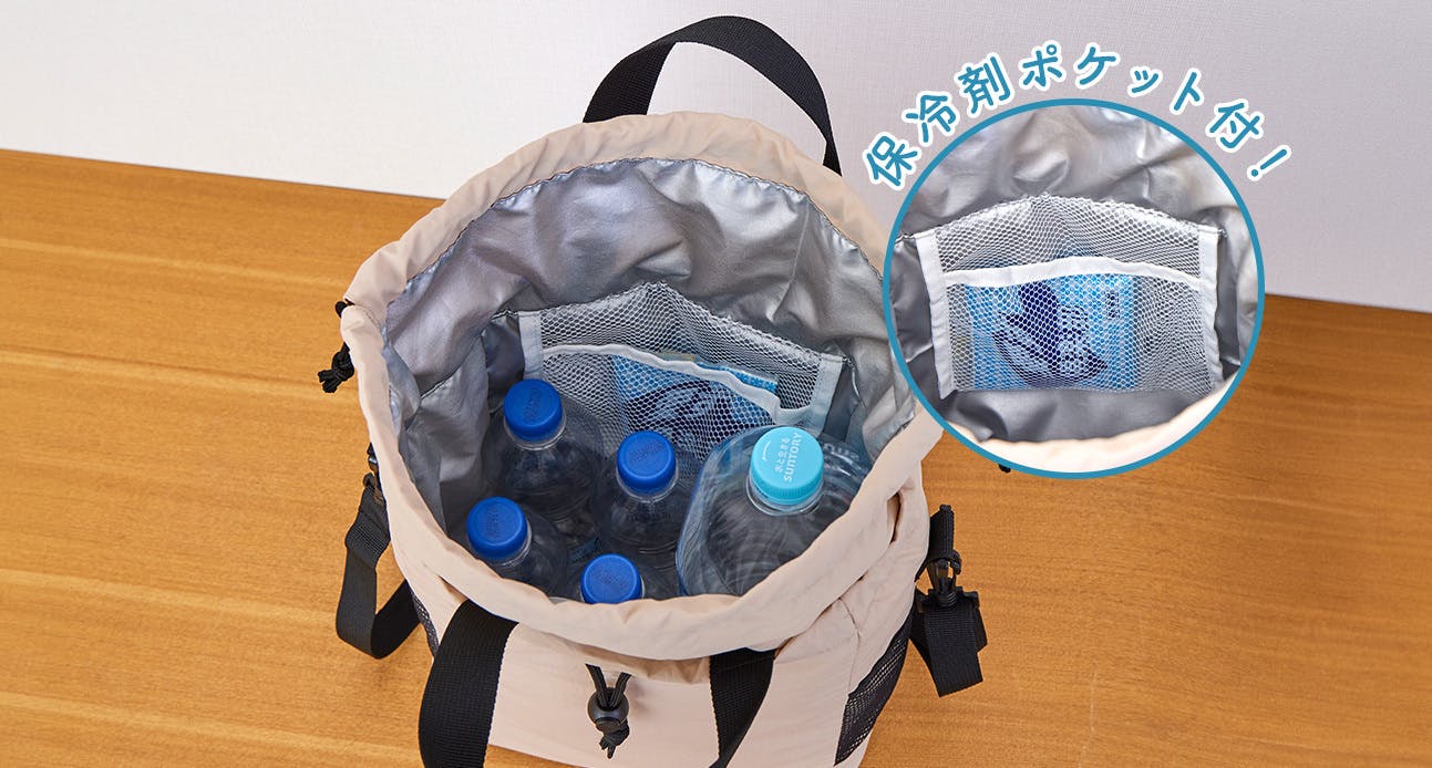 ・メッシュポケット:保冷剤を入れられるポケットを完備。