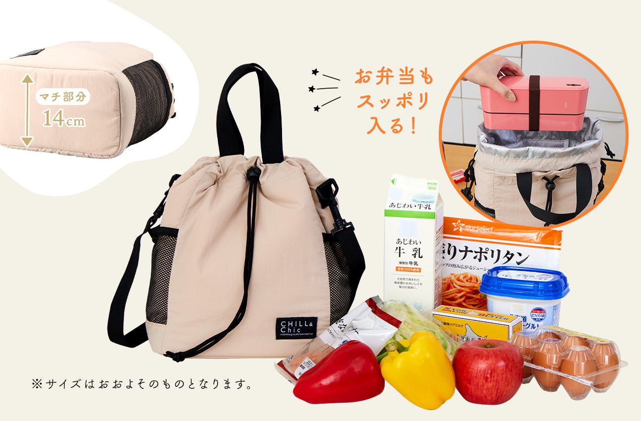 外側と内側の2段階の巾着仕様でしっかり密封! 冷気や熱気を逃しにくく、食材やお弁当、飲み物の保冷・保温します。