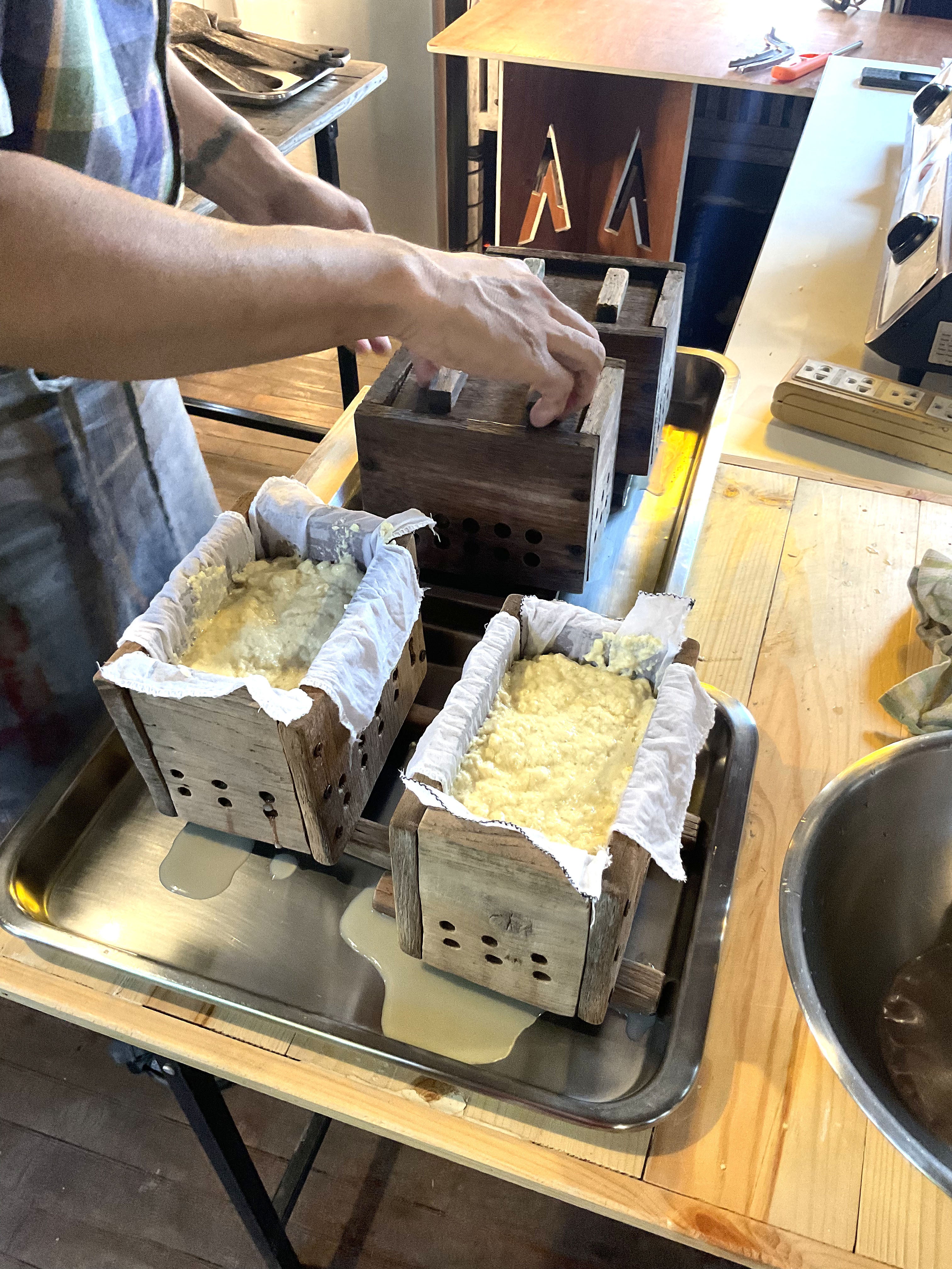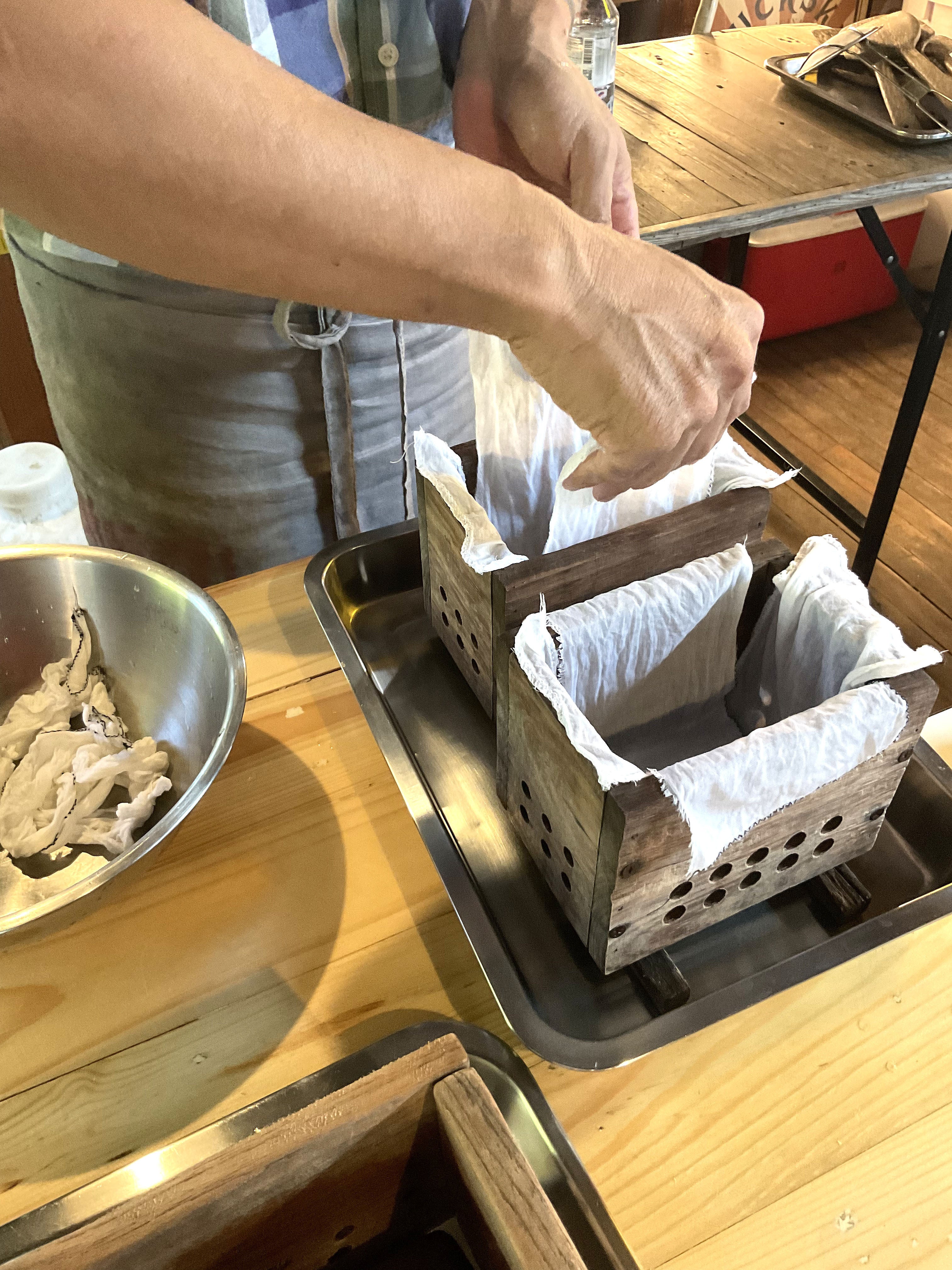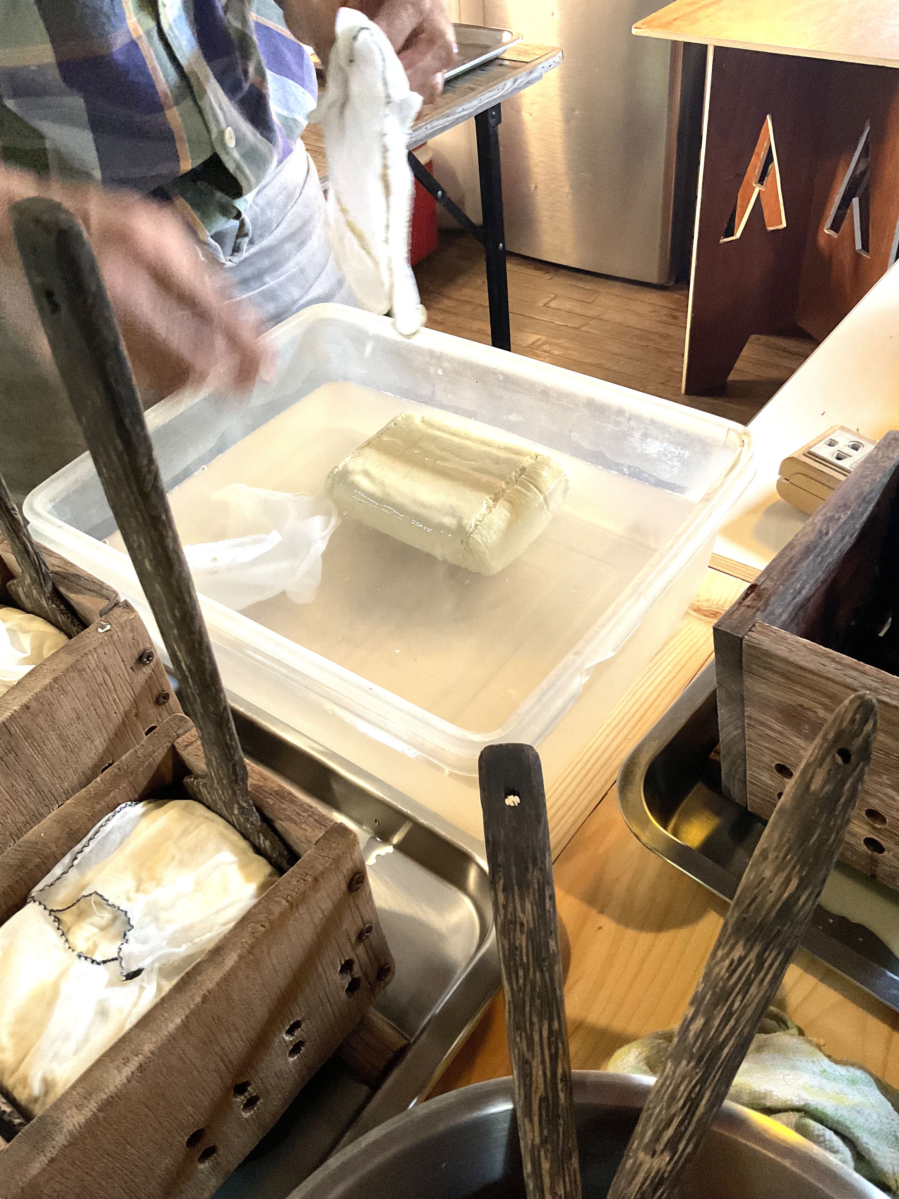 蓋をすること(時には重しを置く事も)で豆腐から水が抜けていき...豆腐の表面にはその布目が付き...形が整っていきます□