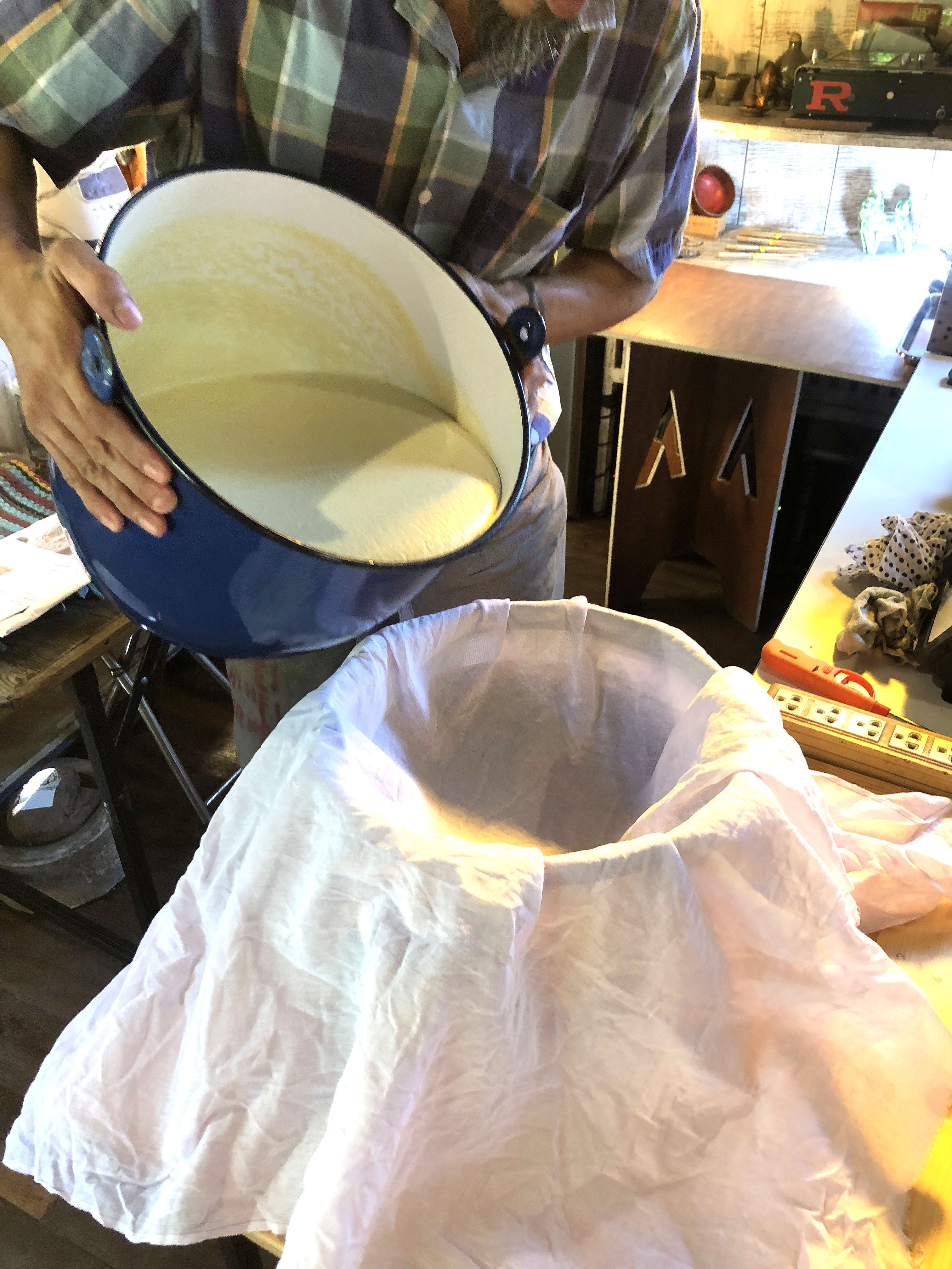 私は石臼を使って大豆を引いてから...竹ざるで皮を飛ばしてから、豆腐作りにかかります。