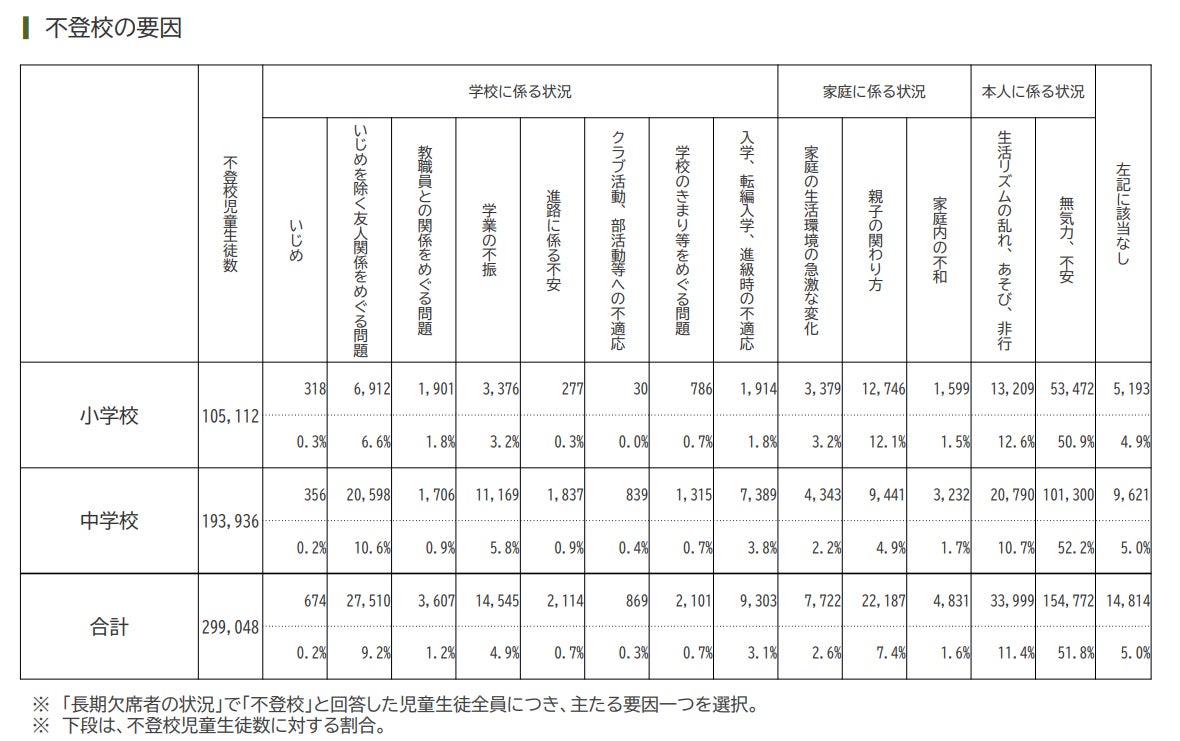 ・不登校になる要因として「いじめ」よりも、「いじめを除く友人関係をめぐる問題」の割合が高く、小学校、中学校ともに一番大きな不登校の要因は本人に係る状況の中の「無気力・不安」なのです。
