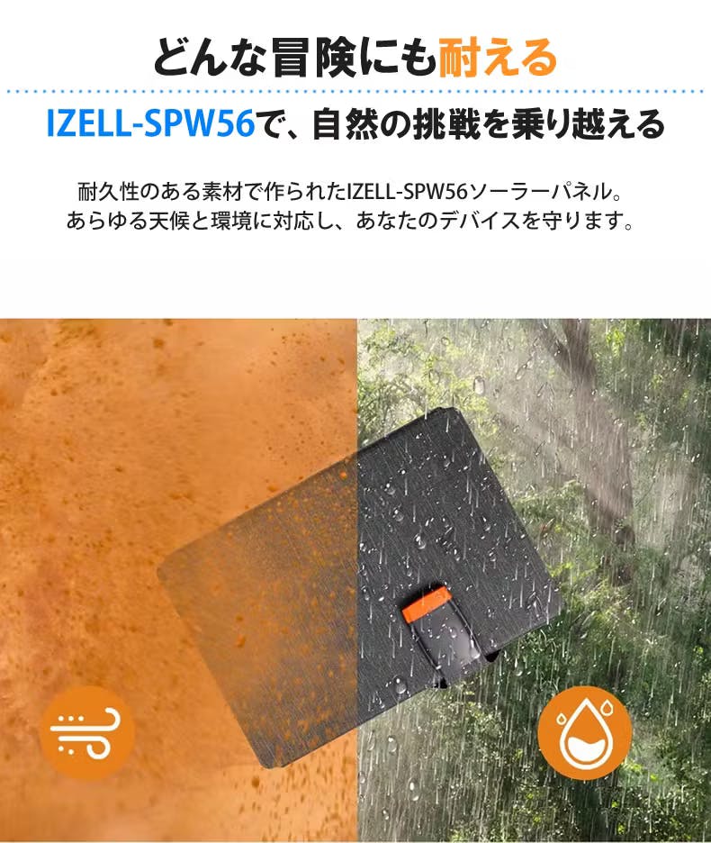 アウトドア用のソーラーパネルは、雨や風など厳しい自然にも耐えられる丈夫さが求められます。IZELL-SPW56は、水を弾いて汚れにも強い耐久性の高い素材を使っているので、どんな天気や状況でもデバイスを守ります。※ただし、水没は避けてください(IPX4相当)。