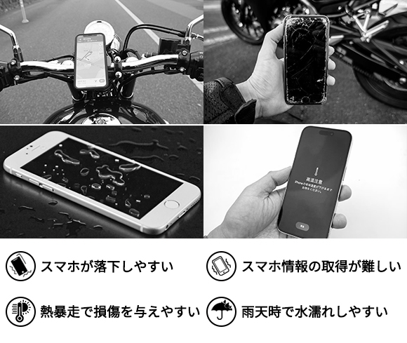 バイクで走行する際に、スマホをカーナビとして利用するバイクライダーが増えています。しかし、走行中の振動でスマホが落下したり、直射日光による過熱でスマホが損傷したりするおそれがあります。