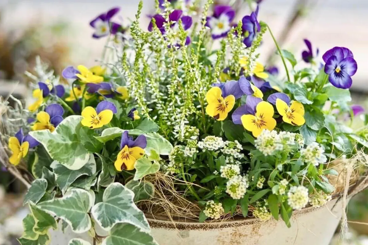 晩秋に植付け寒い冬の間も咲き続け春先に花誇る「ビオラやパンジー、金魚草の寄せ植え」